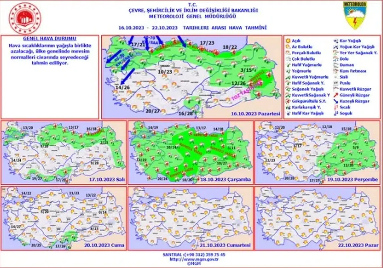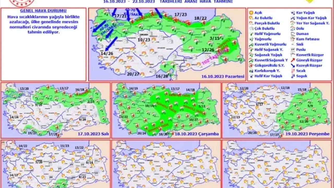 16 - 22 Ekim 2023 hava sıcaklıklarının yağışlarıyla birlikte azalacağı, ülke genelinde mevsim normallerinin yaklaşık olarak seyredeceği tahmin ediliyor.