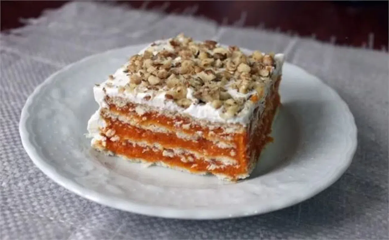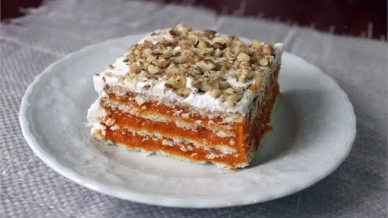 Orta ebatta bir tepsiye bir kat balkabağı yayıp bir sıra bisküvi diziyoruz. Üzerine tekrar balkabağı ilave ediyoruz.Tatlımız 3 sıra halinde hazırlandıktan sonra en son katmana krem şanti ve süt ile çırpılmış olan karışımımızı sürüyoruz.