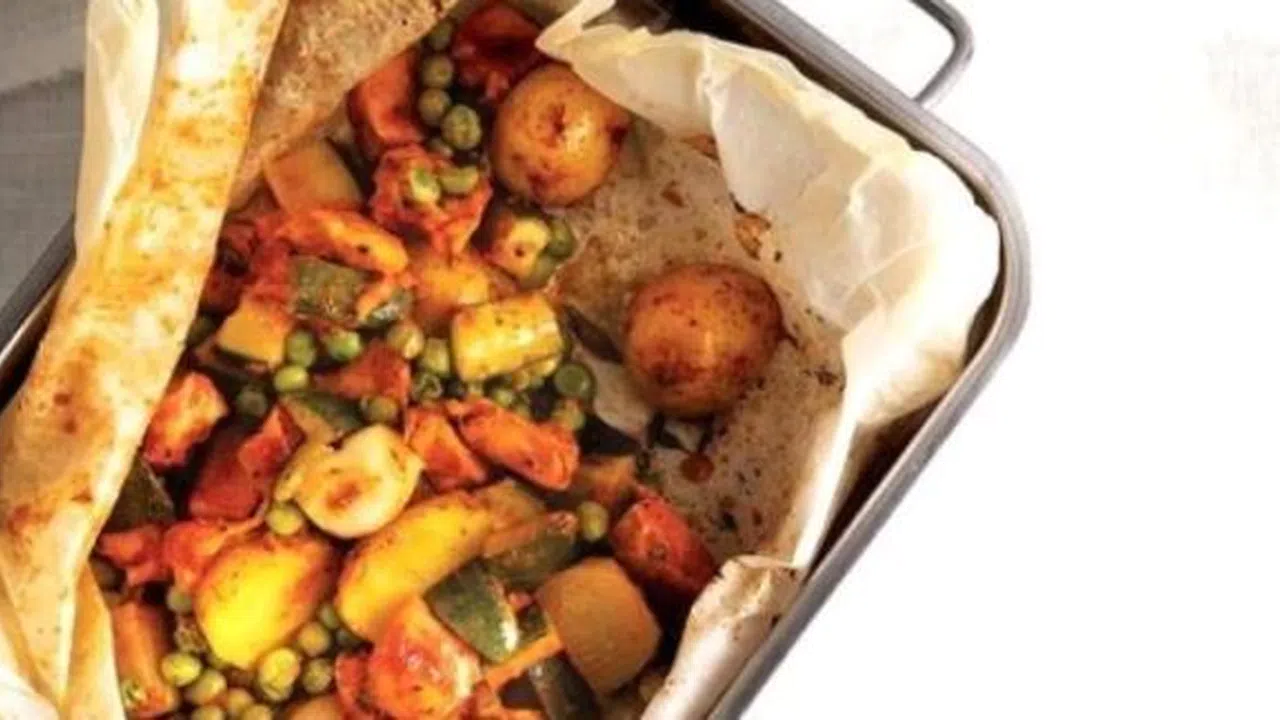 Tezgaha pişirme kağıdını alarak serelim, ortasına bir porsiyon kadar sebzeli tavuğumuzdan yerleştirelim.
