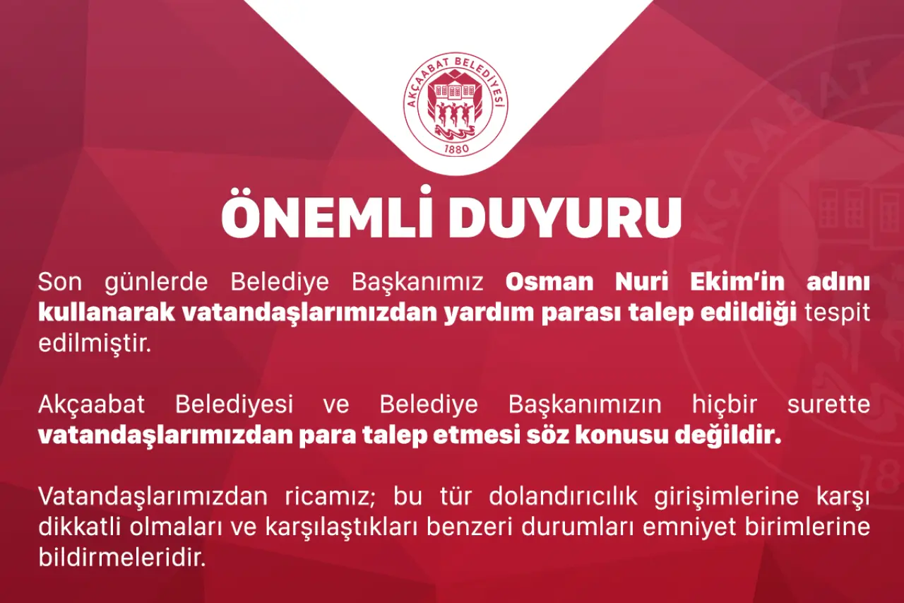 Belediyeden yapılan açıklamada, “Son günlerde Belediye Başkanı Osman Nuri Ekim’in adını kullanarak vatandaşlarımızdan yardım parası talep edildiği tespit edilmiştir. Akçaabat Belediyesi ve Belediye Başkanımız hiçbir surette vatandaşlarımızdan para talep etmemektedir” ifadelerine yer verildi.