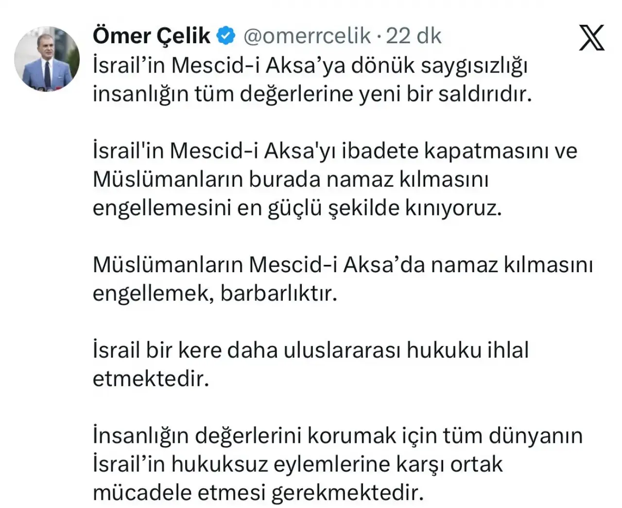 Açıklamasında İsrail’in Mescid-i Aksa’da ibadet edilmesini engellemesini sert sözlerle eleştiren Ömer Çelik, bu durumun kabul edilemez olduğunu belirtti. Çelik, İsrail’in attığı adımların yalnızca dini haklara değil, evrensel değerlere de zarar verdiğini vurguladı.