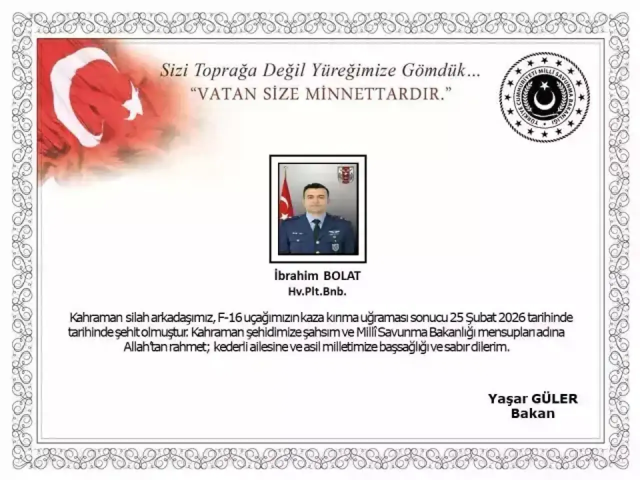 Balıkesir'de kaza kırıma uğrayan F-16'nın pilotu Hava Pilot Binbaşı İbrahim Bolat şehit oldu. Olay sonrası Adalet Bakanı geniş çaplı bir soruşturma başlattı. Bolat'ın cenazesi İzmir'de Kadifekale Şehitliği'ne defnedilecek.