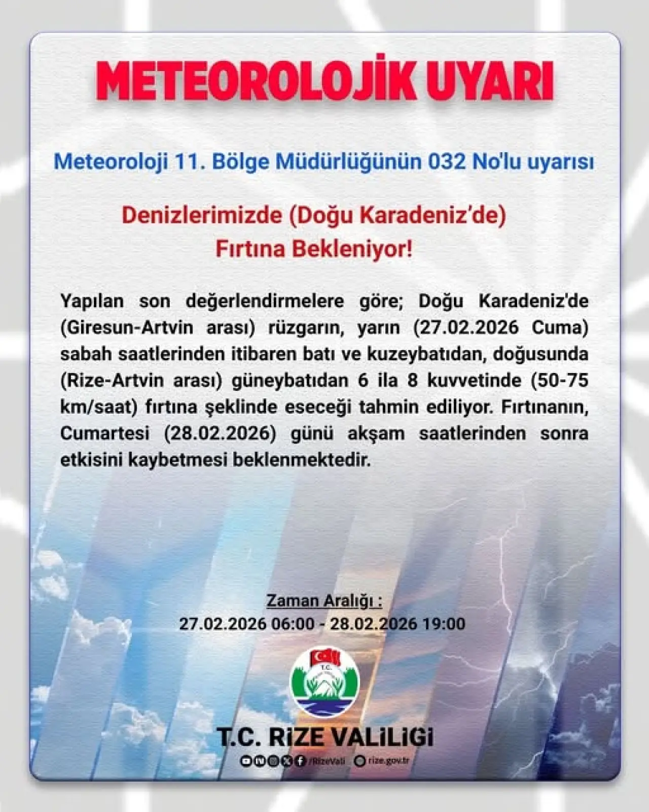 Yapılan son değerlendirmelere göre, Doğu Karadeniz’de (Giresun-Artvin arası) rüzgarın 27 Şubat 2026 Cuma günü sabah saatlerinden itibaren batı ve kuzeybatıdan, doğusunda (Rize-Artvin arası) ise güneybatıdan 6 ila 8 kuvvetinde (50-75 km/saat) fırtına şeklinde eseceği tahmin ediliyor.