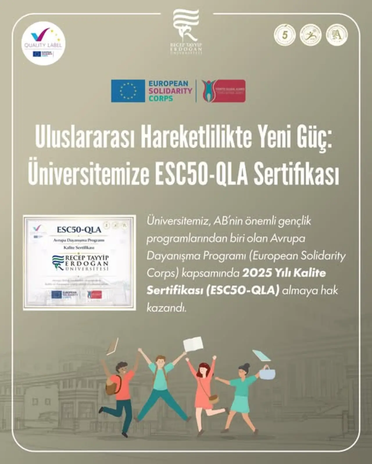 ESC50-QLA Kalite Sertifikası, kurumların Avrupa Dayanışma Programı çerçevesinde yürüttüğü projelerde belirli kalite standartlarını sağladığını ve sürdürülebilir bir proje yönetim altyapısına sahip olduğunu belgeliyor. Recep Tayyip Erdoğan Üniversitesi bu sertifika ile birlikte gençlerin sosyal katılımını artırmaya, gönüllülük faaliyetlerini teşvik etmeye ve uluslararası hareketlilik fırsatlarını genişletmeye yönelik projelerde daha güçlü ve aktif bir rol üstlenme imkânı elde etti.