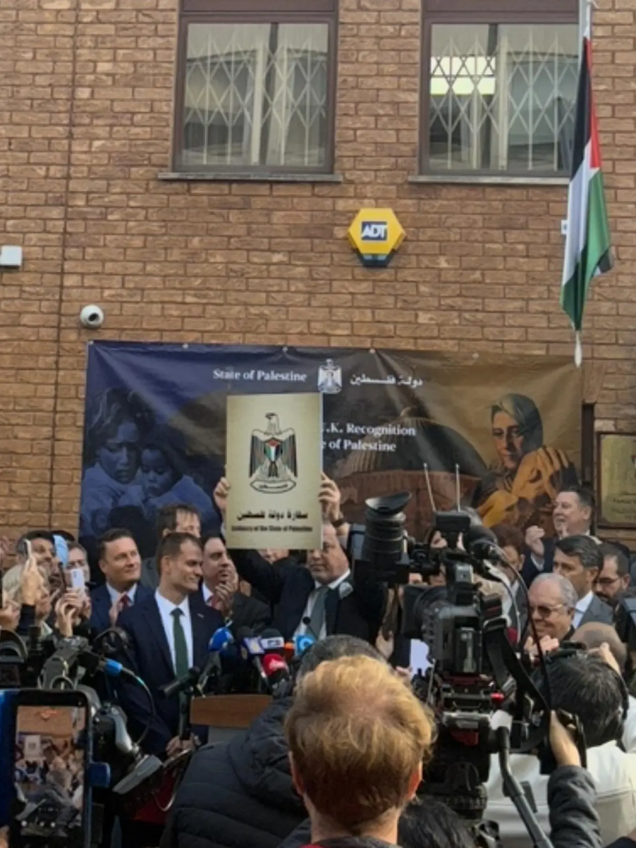 Londra'da, İngiltere'nin Filistin'i devlet olarak tanımasından sonra Filistin elçiliği açıldı. Elçilik binası önünde gerçekleştirilen törenle Filistin bayrağı göndere çekildi.