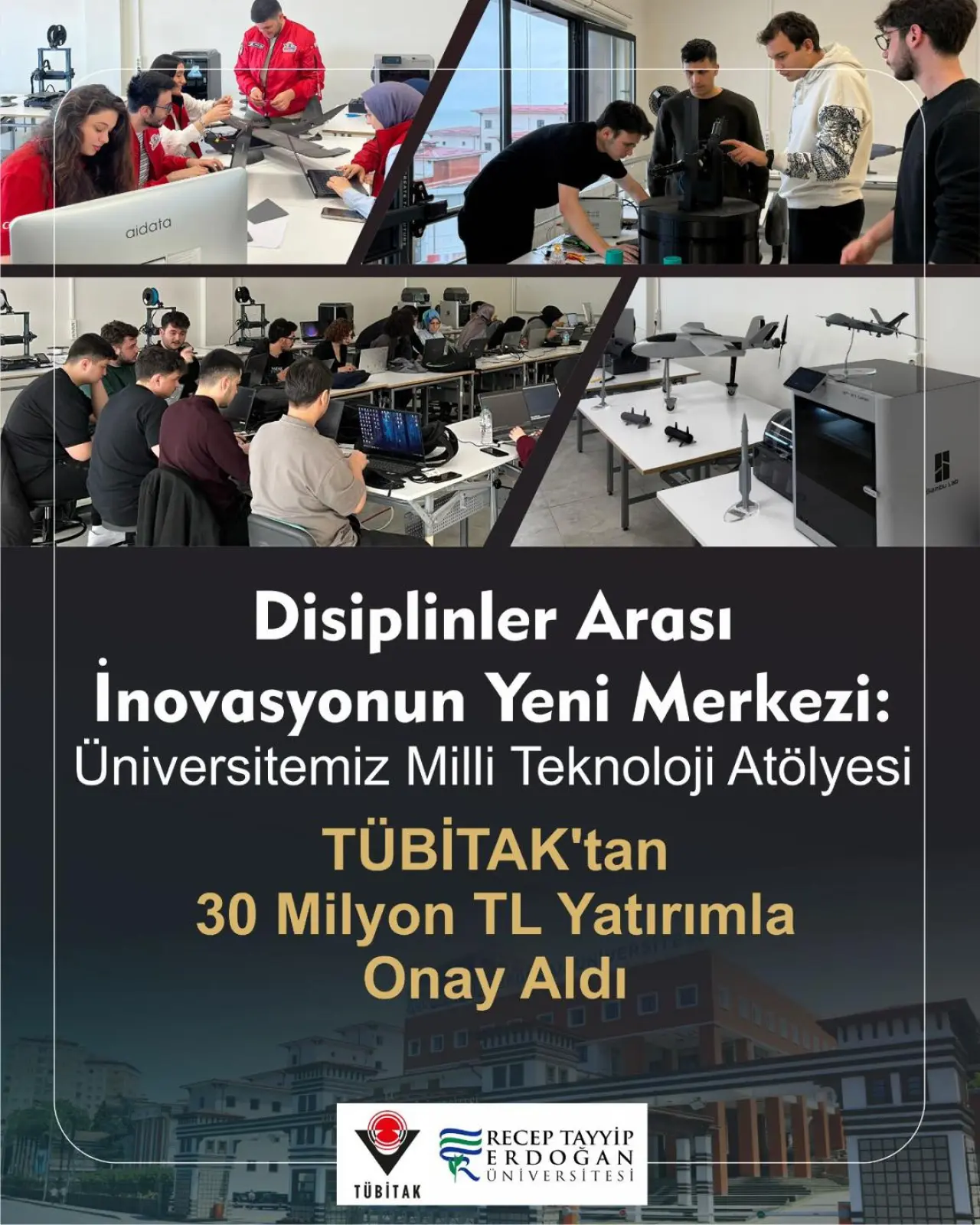 Recep Tayyip Erdoğan Üniversitesi, bilim ve teknoloji alanındaki yatırımlarına bir yenisini daha ekledi. Üniversitenin Geliştirme Vakfı katkılarıyla ilk adımı geçtiğimiz yıl atılan "Milli Teknoloji Atölyesi", TÜBİTAK'ın 4003-T Milli Teknoloji Atölyeleri çağrısı kapsamında 30 milyon TL tutarında destek almaya hak kazandı.