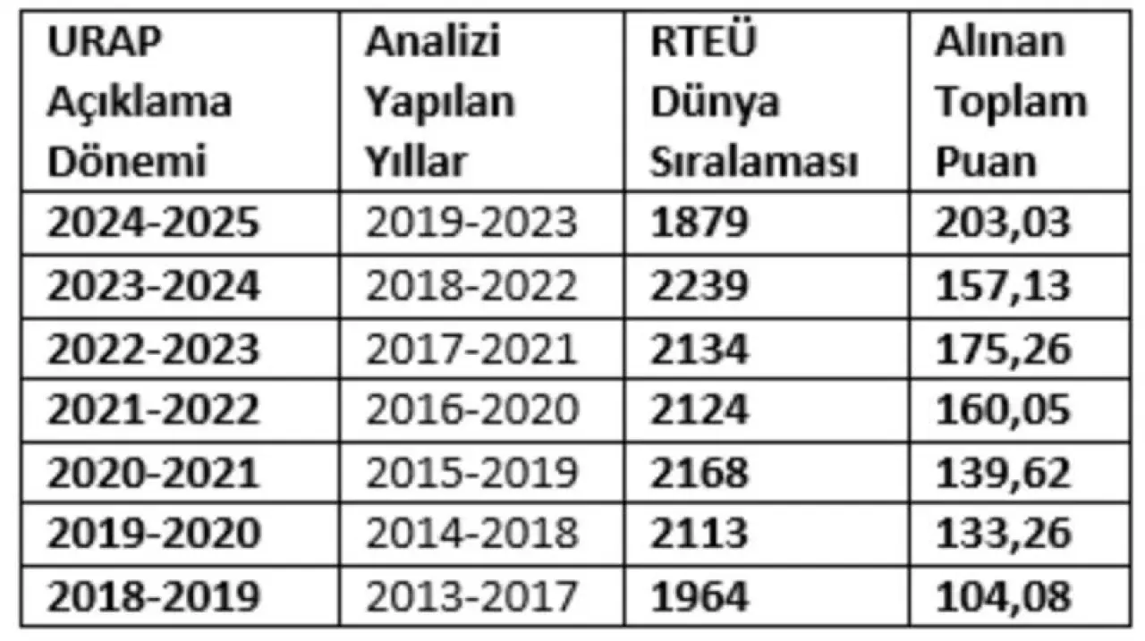 RTEÜ’ye atanan Prof. Dr. Yılmaz’ın 2023, 2024, 2025 ve 2026 yılları, kendi döneminin değerlendirileceği yıllar olacaktır. Bu yıl açıklanan URAP 2024–2025 Dünya Üniversiteleri Sıralaması, RTEÜ’nün 2019–2023 verilerini içermektedir.