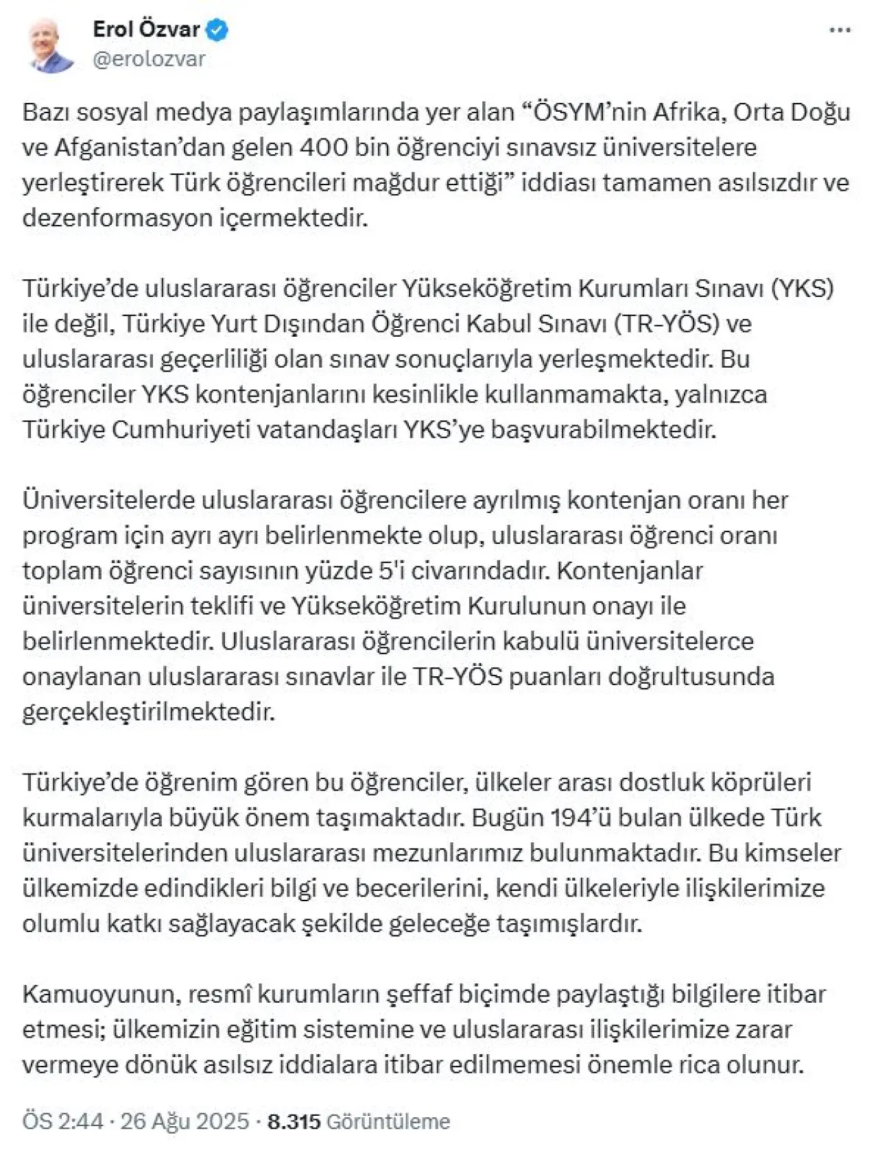 YÖK Başkanı Erol Özvar, sosyal medya hesabından yaptığı açıklamada, "Bazı sosyal medya paylaşımlarında yer alan 'ÖSYM'nin Afrika, Orta Doğu ve Afganistan'dan gelen 400 bin öğrenciyi sınavsız üniversitelere yerleştirerek Türk öğrencileri mağdur ettiği' iddiası tamamen asılsızdır ve dezenformasyon içermektedir. Türkiye'de uluslararası öğrenciler, Yükseköğretim Kurumları Sınavı (YKS) ile değil, Türkiye Yurt Dışından Öğrenci Kabul Sınavı (TR-YÖS) ve uluslararası geçerliliği olan sınav sonuçlarıyla yerleşmektedir. Bu öğrenciler YKS kontenjanlarını kesinlikle kullanmamakta, yalnızca Türkiye Cumhuriyeti vatandaşları YKS'ye başvurabilmektedir. Üniversitelerde uluslararası öğrencilere ayrılmış kontenjan oranı her program için ayrı ayrı belirlenmekte olup, uluslararası öğrenci oranı toplam öğrenci sayısının yüzde 5'i civarındadır. Kontenjanlar üniversitelerin teklifi ve Yükseköğretim Kurulu'nun onayı ile belirlenmektedir. Uluslararası öğrencilerin kabulü, üniversitelerce onaylanan uluslararası sınavlar ile TR-YÖS puanları doğrultusunda gerçekleştirilmektedir" ifadelerini kullandı.