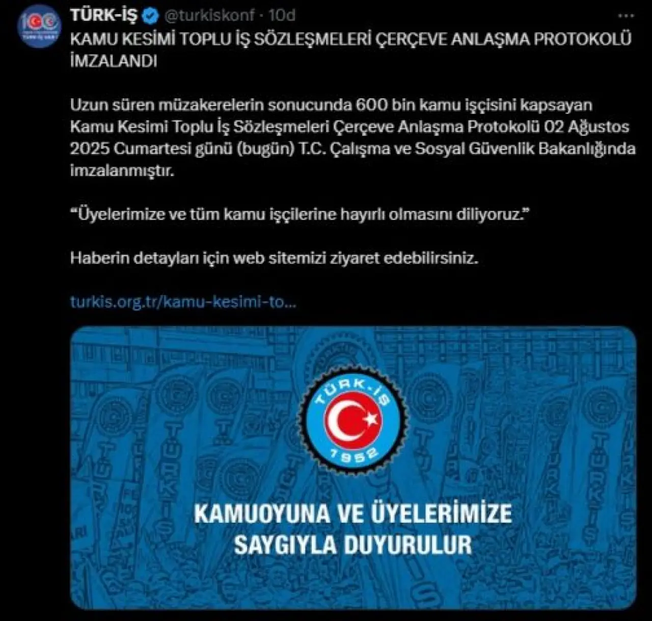 İmzalanan protokole göre kamu işçilerine 2025 yılı için iki aşamalı ücret artışı uygulanacak. Yılın ilk 6 ayı için yüzde 24, ikinci 6 ayı için ise yüzde 11 oranında zam yapılacak. Buna ek olarak kamu işçilerine günlük 50 TL, aylık 1500 TL seyyanen zam verilecek. Bu düzenlemeyle kamu işçisinin taban maaşı ciddi oranda artarken, grev kararının da önüne geçilmiş oldu.