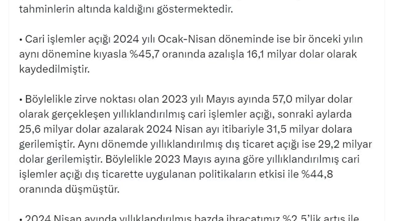 Bakan Bolat, sosyal medya hesabından yaptığı açıklamada, 2024 yılı Nisan ayında negatif takvim etkisi nedeniyle cari işlemler açığının yüzde 3,9 oranında artışla 5,3 milyar dolar olarak gerçekleştiğini belirterek, "Bu rakam, tahminlerin altında kaldığını göstermektedir. Cari işlemler açığı 2024 yılı Ocak-Nisan döneminde ise bir önceki yılın aynı dönemine kıyasla yüzde 45,7 oranında azalışla 16,1 milyar dolar olarak kaydedilmiştir. Böylelikle zirve noktası olan 2023 yılı Mayıs ayında 57 milyar dolar olarak gerçekleşen yıllıklandırılmış cari işlemler açığı, sonraki aylarda 25,6 milyar dolar azalarak 2024 Nisan ayı itibarıyla 31,5 milyar dolara gerilemiştir. Aynı dönemde yıllıklandırılmış dış ticaret açığı ise 29,2 milyar dolar gerilemiştir. Böylelikle 2023 Mayıs ayına göre, yıllıklandırılmış cari işlemler açığı dış ticarette uygulanan politikaların etkisi ile yüzde 44,8 oranında düşmüştür" ifadelerini kullandı.