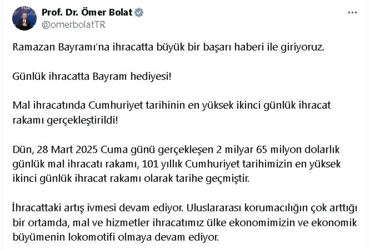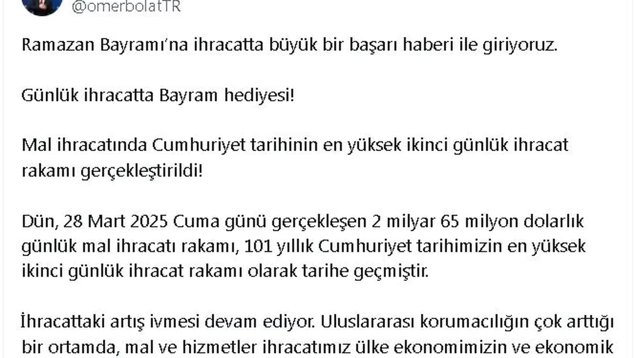 Ticaret Bakanı Ömer Bolat, sosyal medya hesabından yaptığı açıklamada, "Ramazan Bayramı'na ihracatta büyük bir başarı haberi ile giriyoruz. Günlük ihracatta bayram hediyesi. Mal ihracatında Cumhuriyet tarihinin en yüksek ikinci günlük ihracat rakamı gerçekleştirildi. Dün, 28 Mart 2025 Cuma günü gerçekleşen 2 milyar 65 milyon dolarlık günlük mal ihracatı rakamı, 101 yıllık Cumhuriyet tarihimizin en yüksek ikinci günlük ihracat rakamı olarak tarihe geçmiştir" ifadelerini kullandı.