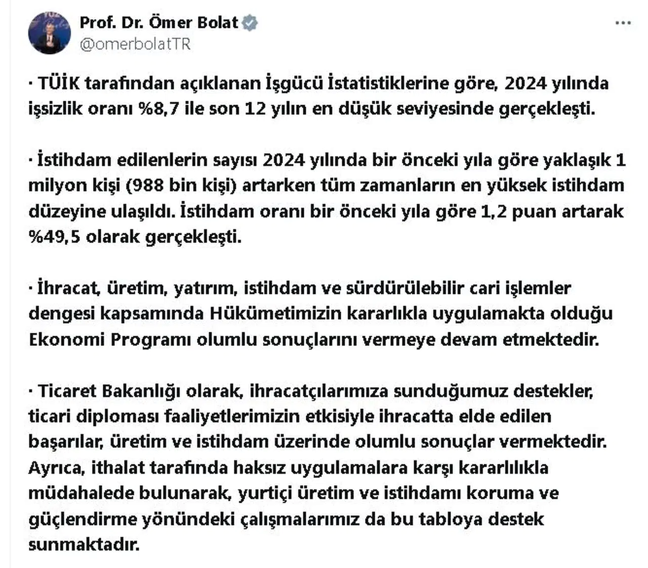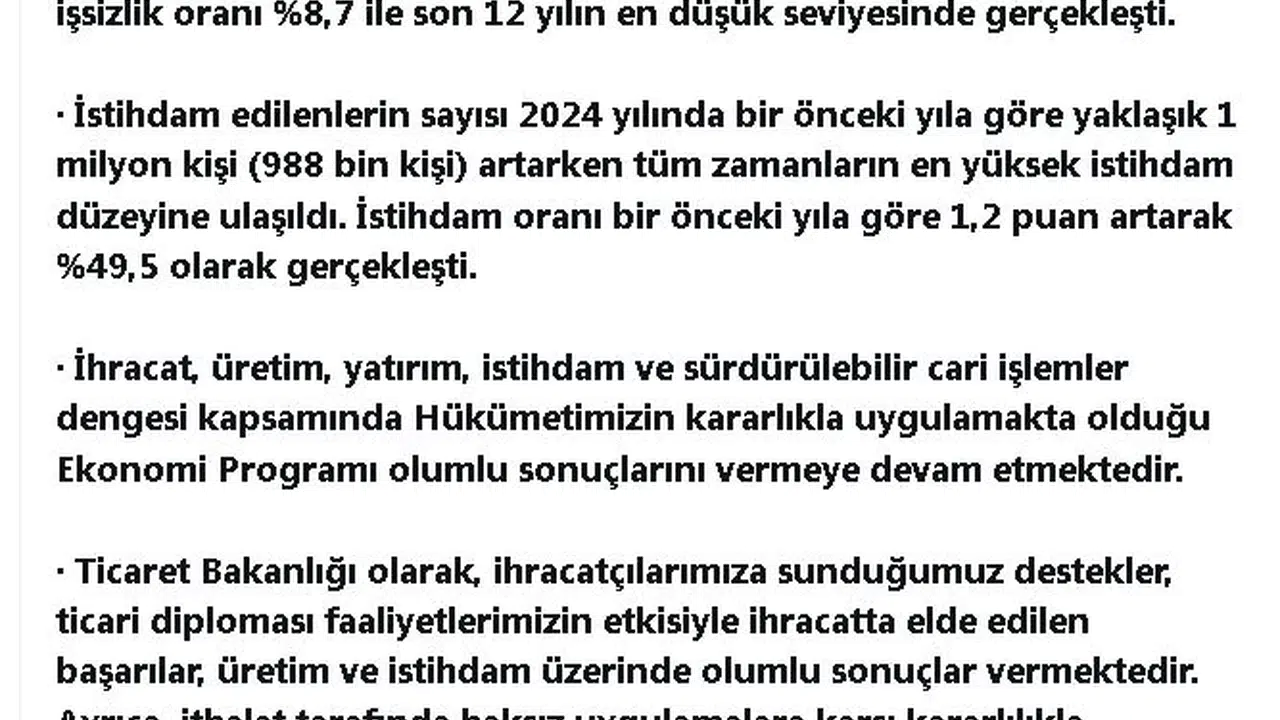 Ticaret Bakanı Ömer Bolat, iş gücü istatistiklerine ilişkin sosyal medya hesabından yaptığı açıklamada, "TÜİK tarafından açıklanan iş gücü istatistiklerine göre, 2024 yılında işsizlik oranı yüzde 8,7 ile son 12 yılın en düşük seviyesinde gerçekleşti. İstihdam edilenlerin sayısı 2024 yılında bir önceki yıla göre yaklaşık 1 milyon kişi (988 bin kişi) artarken, tüm zamanların en yüksek istihdam düzeyine ulaşıldı. İstihdam oranı bir önceki yıla göre 1,2 puan artarak yüzde 49,5 olarak gerçekleşti. İhracat, üretim, yatırım, istihdam ve sürdürülebilir cari işlemler dengesi kapsamında hükümetimizin kararlıkla uygulamakta olduğu ekonomi programı olumlu sonuçlarını vermeye devam etmektedir. Ticaret Bakanlığı olarak, ihracatçılarımıza sunduğumuz destekler, ticari diplomasi faaliyetlerimizin etkisiyle ihracatta elde edilen başarılar, üretim ve istihdam üzerinde olumlu sonuçlar vermektedir. Ayrıca, ithalat tarafında haksız uygulamalara karşı kararlılıkla müdahalede bulunarak, yurt içi üretim ve istihdamı koruma ve güçlendirme yönündeki çalışmalarımız da bu tabloya destek sunmaktadır" ifadelerini kullandı.