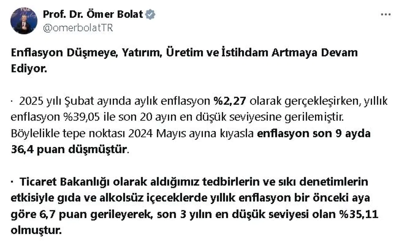 TÜFE'deki aylık değişimin yüzde 2,27 olarak gerçekleştiğini aktaran Bakan Bolat, "Böylece yıllık enflasyon yüzde 39,05 ile son 20 ayın en düşük seviyesine gerilemiştir. Böylelikle 2024 Mayıs ayına kıyasla enflasyon son 9 ayda 36,4 puan gerilemiştir. Yİ-ÜFE'deki değişim 2025 yılı şubat ayında bir önceki aya göre yüzde 2,12 olarak gerçekleşmiş, böylece yıllık enflasyon yüzde 25,21 ile son 4 yılın en düşük seviyesine gerilemiştir. Gıda ve alkolsüz içeceklerde yıllık enflasyon bir önceki aya göre 6,7 puan gerileyerek yüzde 35,11 olmuştur. İşlenmemiş gıdada yıllık enflasyon bir önceki aya göre 10,42 puan gerileyerek yüzde 33,75 olurken taze sebze ve meyvede yıllık enflasyon bir önceki aya göre 21,32 puan gerileyerek yüzde 40,82 olmuştur. Enerji ve gıda dışı mallarda yıllık enflasyon bir önceki aya göre 2,0 puan gerileyerek yüzde 23,16 olurken temel mallarda yıllık enflasyon bir önceki aya göre 2,2 puan gerileyerek yüzde 21,71 olmuştur. Çekirdek TÜFE C endeksinde (enerji, gıda ve içecekler ile tütün ürünleri ve altın hariç, TÜFE) yıllık enflasyon bir önceki aya göre 2,4 puan gerileyerek yüzde 40,21 olmuştur. Fiyat katılığının yüksek olduğu hizmetler grubunda yıllık enflasyon bir önceki aya göre 3,2 puan gerileyerek yüzde 59,78 olmuştur. Yıllık enflasyondaki gerilemenin önümüzdeki aylarda da devam etmesini bekliyoruz" açıklamasında bulundu. (DHA)