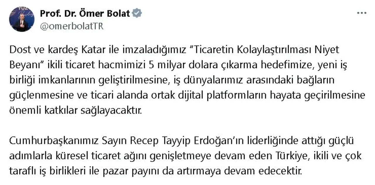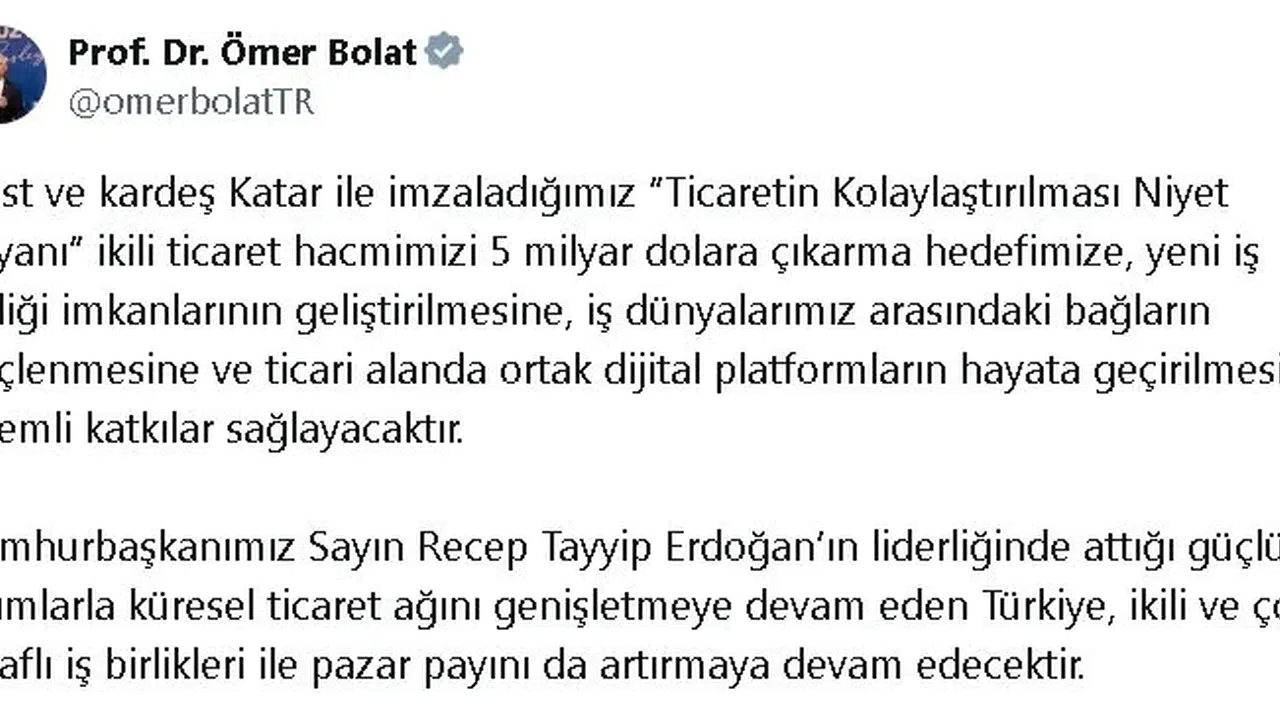 Bakan Bolat, sosyal medya hesabından yaptığı açıklamada, "Dost ve kardeş Katar ile imzaladığımız 'Ticaretin Kolaylaştırılması Niyet Beyanı' ikili ticaret hacmimizi 5 milyar dolara çıkarma hedefimize, yeni iş birliği imkanlarının geliştirilmesine, iş dünyalarımız arasındaki bağların güçlenmesine ve ticari alanda ortak dijital platformların hayata geçirilmesine önemli katkılar sağlayacaktır. Cumhurbaşkanımız Sayın Recep Tayyip Erdoğan'ın liderliğinde attığı güçlü adımlarla küresel ticaret ağını genişletmeye devam eden Türkiye, ikili ve çok taraflı iş birlikleri ile pazar payını da artırmaya devam edecektir" dedi. (DHA)