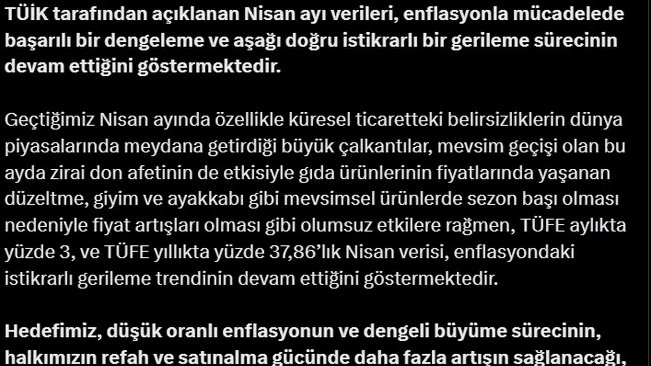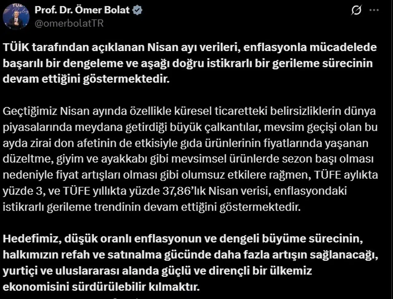 ANKARA, (DHA)-TİCARET Bakanı Ömer Bolat, "TÜİK tarafından açıklanan nisan ayı verileri, enflasyonla mücadelede başarılı bir dengeleme ve aşağı doğru istikrarlı bir gerileme sürecinin devam ettiğini göstermektedir" dedi.
