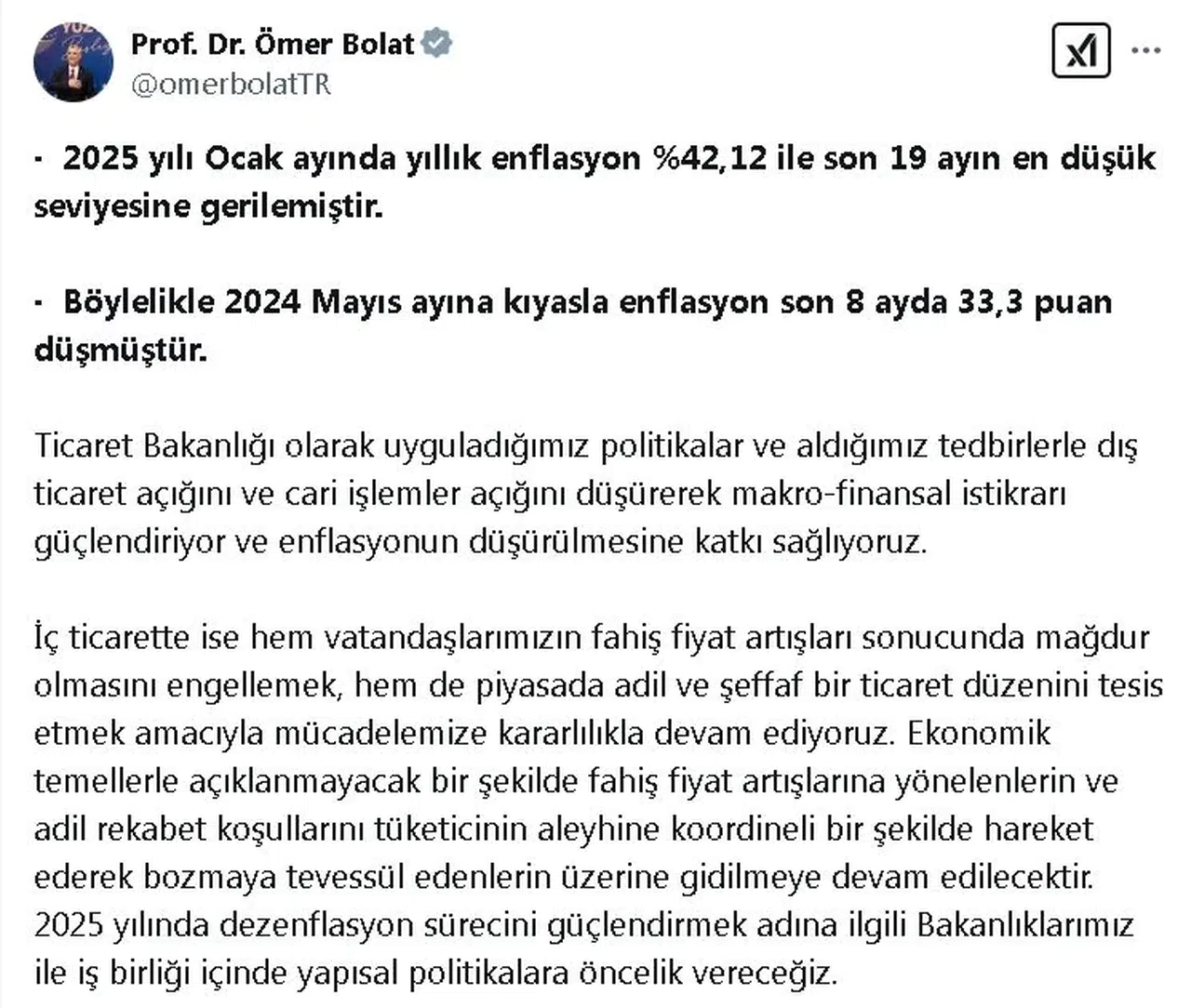 Ticaret Bakanı Ömer Bolat, ocak ayı enflasyon verilerine ilişkin sosyal medya hesabından yaptığı açıklamada, "Ticaret Bakanlığı olarak uyguladığımız politikalar ve aldığımız tedbirlerle dış ticaret açığını ve cari işlemler açığını düşürerek makro-finansal istikrarı güçlendiriyor ve enflasyonun düşürülmesine katkı sağlıyoruz. İç ticarette ise hem vatandaşlarımızın fahiş fiyat artışları sonucunda mağdur olmasını engellemek, hem de piyasada adil ve şeffaf bir ticaret düzenini tesis etmek amacıyla mücadelemize kararlılıkla devam ediyoruz. Ekonomik temellerle açıklanmayacak bir şekilde fahiş fiyat artışlarına yönelenlerin ve adil rekabet koşullarını tüketicinin aleyhine koordineli bir şekilde hareket ederek bozmaya tevessül edenlerin üzerine gidilmeye devam edilecektir. 2025 yılında dezenflasyon sürecini güçlendirmek adına ilgili Bakanlıklarımız ile iş birliği içinde yapısal politikalara öncelik vereceğiz" dedi.