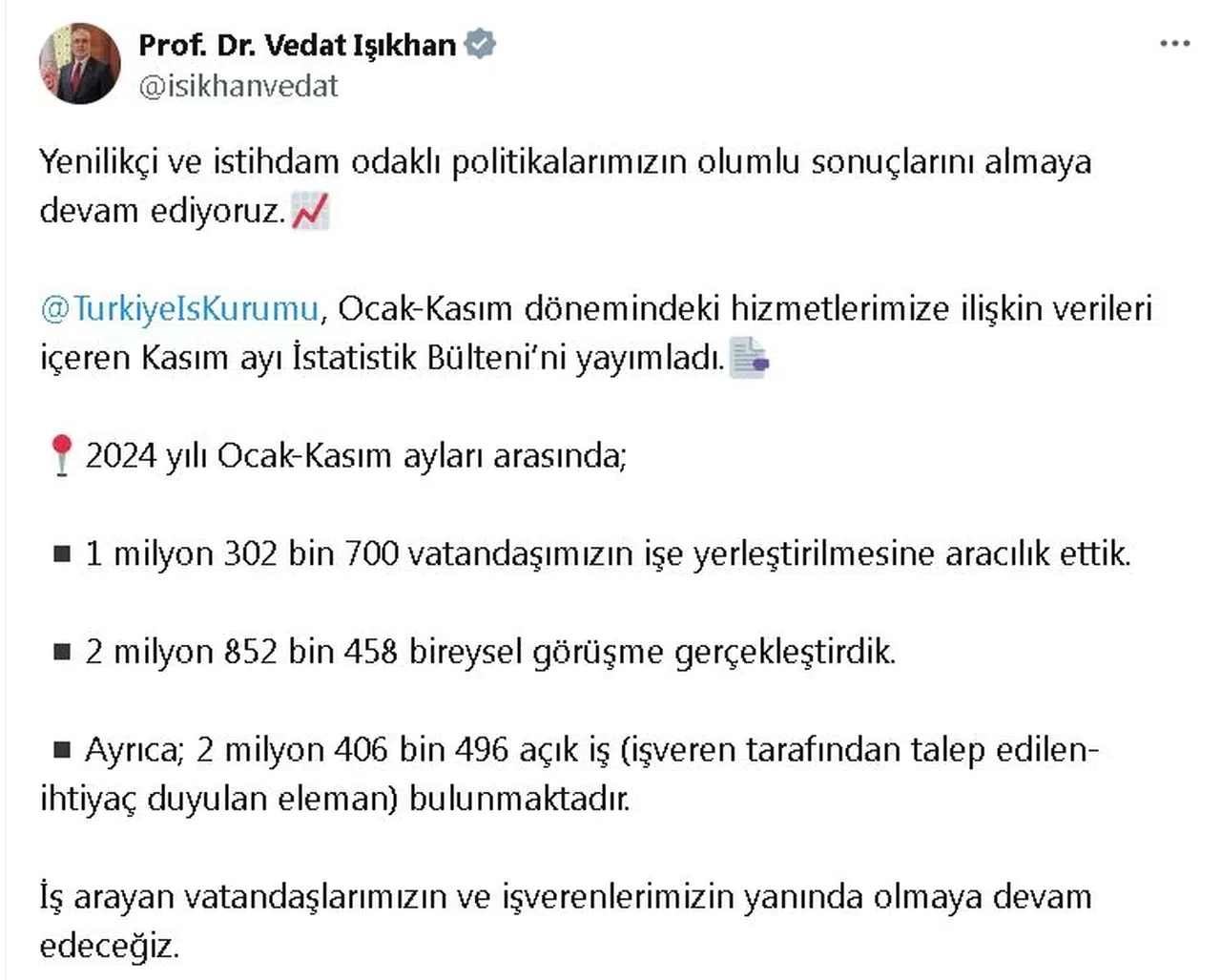 ANKARA, (DHA)- ÇALIŞMA ve Sosyal Güvenlik Bakanı Vedat Işıkhan, 2024 yılı Ocak-Kasım ayları arasında 1 milyon 302 bin 700 kişinin işe yerleştirilmesine aracılık ettiklerini açıkladı.