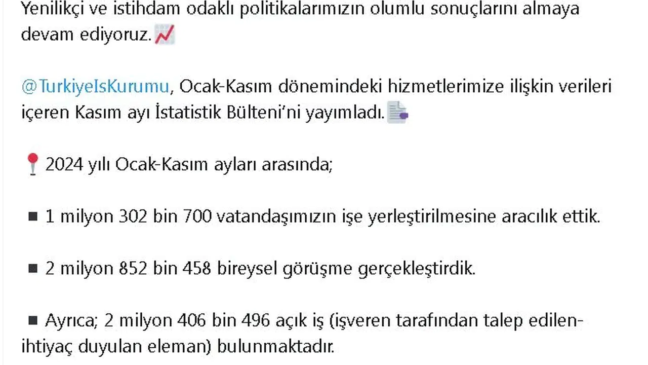 Bakan Vedat Işıkhan, sosyal medya hesabından yaptığı açıklamada, "Yenilikçi ve istihdam odaklı politikalarımızın olumlu sonuçlarını almaya devam ediyoruz. Türkiye İş Kurumu, ocak-kasım dönemindeki hizmetlerimize ilişkin verileri içeren Kasım Ayı İstatistik Bülteni'ni yayımladı. 2024 yılı Ocak-Kasım ayları arasında; 1 milyon 302 bin 700 vatandaşımızın işe yerleştirilmesine aracılık ettik. 2 milyon 852 bin 458 bireysel görüşme gerçekleştirdik. Ayrıca; 2 milyon 406 bin 496 açık iş (işveren tarafından talep edilen-ihtiyaç duyulan eleman) bulunmaktadır. İş arayan vatandaşlarımızın ve işverenlerimizin yanında olmaya devam edeceğiz" ifadelerini kullandı. (DHA)