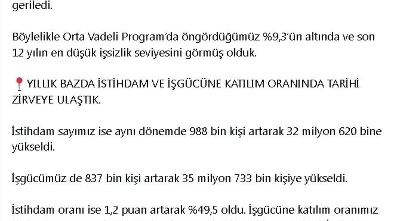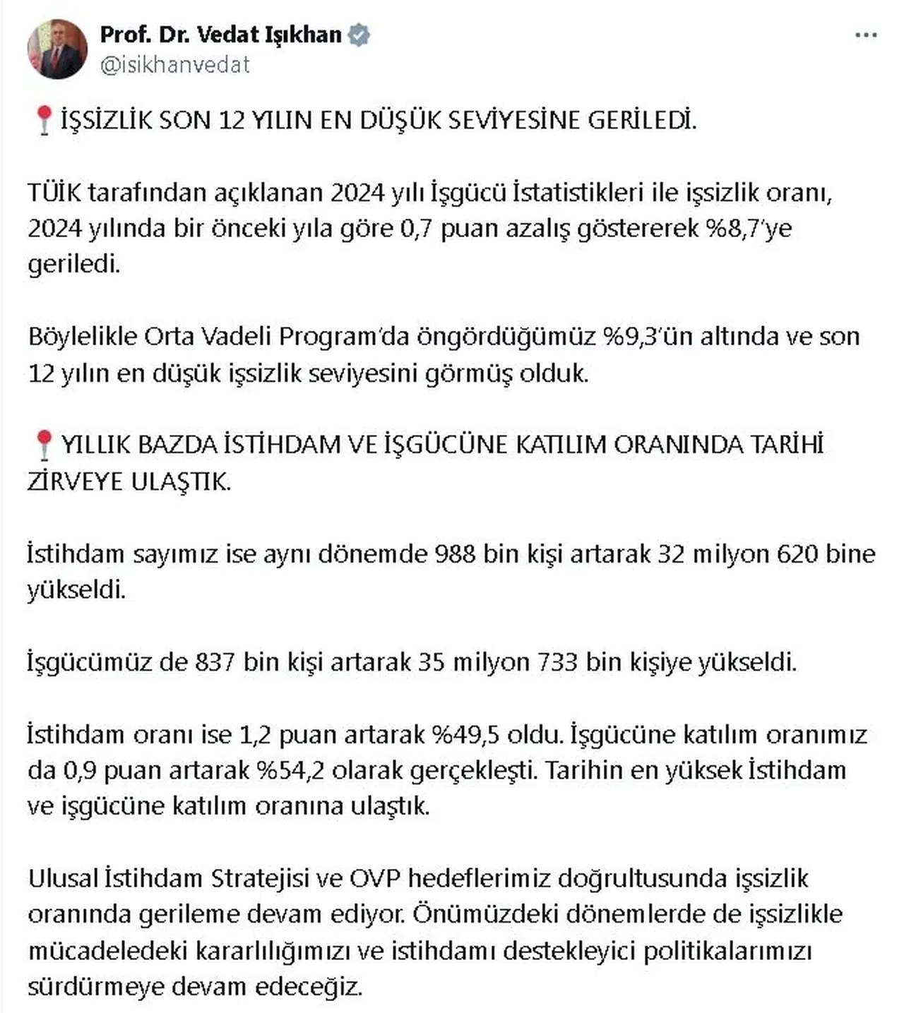 Çalışma ve Sosyal Güvenlik Bakanı Vedat Işıkhan, iş gücü istatistiklerine ilişkin sosyal medya hesabından yaptığı açıklamada, "TÜİK tarafından açıklanan 2024 yılı iş gücü istatistikleri ile işsizlik oranı, 2024 yılında bir önceki yıla göre 0,7 puan azalış göstererek yüzde 8,7'ye geriledi. Böylelikle Orta Vadeli Program'da öngördüğümüz yüzde 9,3'ün altında ve son 12 yılın en düşük işsizlik seviyesini görmüş olduk" ifadelerini kullandı.