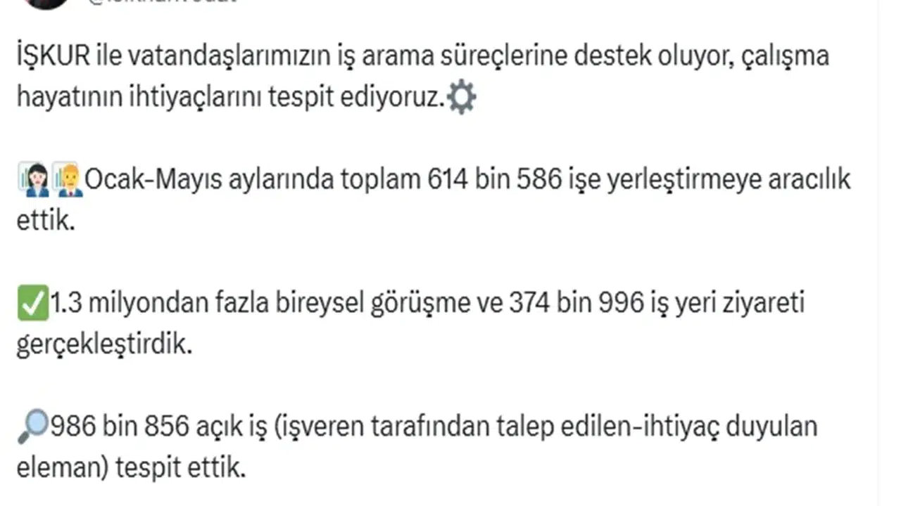 Bakan Vedat Işıkhan, sosyal medya hesabından yaptığı açıklamada, "İŞKUR ile vatandaşlarımızın iş arama süreçlerine destek oluyor, çalışma hayatının ihtiyaçlarını tespit ediyoruz. Ocak-mayıs aylarında toplam 614 bin 586 işe yerleştirmeye aracılık ettik. 1,3 milyondan fazla bireysel görüşme ve 374 bin 996 iş yeri ziyareti gerçekleştirdik. 986 bin 856 açık iş (işveren tarafından talep edilen-ihtiyaç duyulan eleman) tespit ettik" dedi.