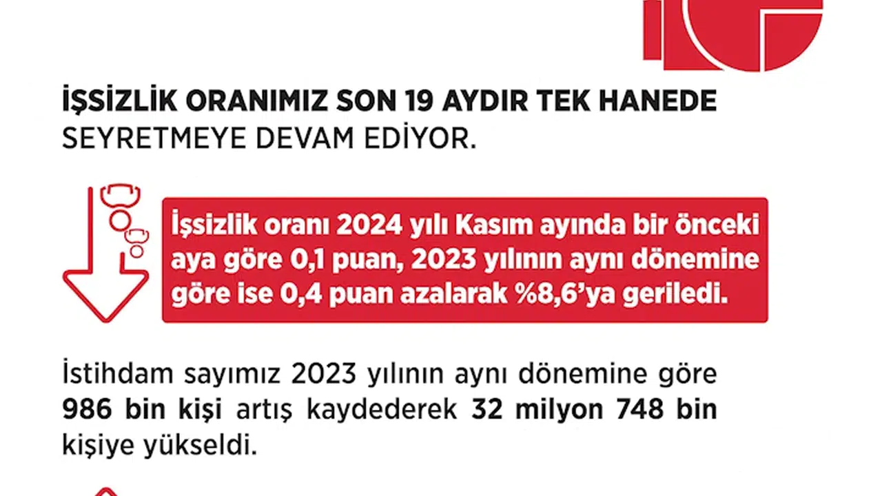 Bakan Işıkhan, kasım ayı iş gücü istatistiklerine ilişkin sosyal medya hesabından yaptığı açıklamada, "İşsizlik oranımız son 19 aydır tek hanede seyretmeye devam ediyor. 2024 yılı Kasım ayında bir önceki aya göre 0,1 puan, 2023 yılı Kasım ayına göre 0,4 puan gerileyen işsizlik oranı yüzde 8,6 olarak gerçekleşti. İstihdam sayımız 2023 yılının aynı dönemine göre 986 bin kişi artış kaydederek 32 milyon 748 bin kişiye yükseldi. İstihdam oranı ise aynı dönemde 1,2 puan artarak yüzde 49,6 seviyesine yükseldi. Küresel, bölgesel ve yerel şartları değerlendirerek politikalarımızı oluşturduğumuz iş gücünde de 2023 yılının aynı dönemine göre 925 bin kişilik bir artış kaydettik. İş gücüne katılma oranı ise aynı dönemde 1 puan artış göstererek yüzde 54,2'ye ulaştı. Temel amacımız; çalışma hayatımızı yenilikçi politikalarla güçlendirmek, istihdam olanaklarımızı artırmak ve işsizlikle kararlılıkla mücadele etmektir" dedi. (DHA)