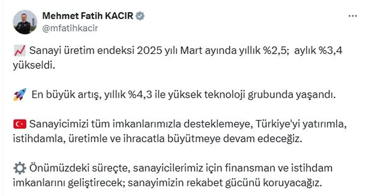 Sanayi ve Teknoloji Bakanı Mehmet Fatih Kacır, sanayi üretimi endeksi verilerine ilişkin sosyal medya hesabından açıklama yaptı. Bakan Kacır, "Sanayi üretim endeksi 2025 yılı Mart ayında yıllık yüzde 2,5, aylık yüzde 3,4 yükseldi. En büyük artış, yıllık yüzde 4,3 ile yüksek teknoloji grubunda yaşandı. Sanayicimizi tüm imkanlarımızla desteklemeye, Türkiye'yi yatırımla, istihdamla, üretimle ve ihracatla büyütmeye devam edeceğiz. Önümüzdeki süreçte, sanayicilerimiz için finansman ve istihdam imkanlarını geliştirecek; sanayimizin rekabet gücünü koruyacağız" ifadelerini kullandı. (DHA)