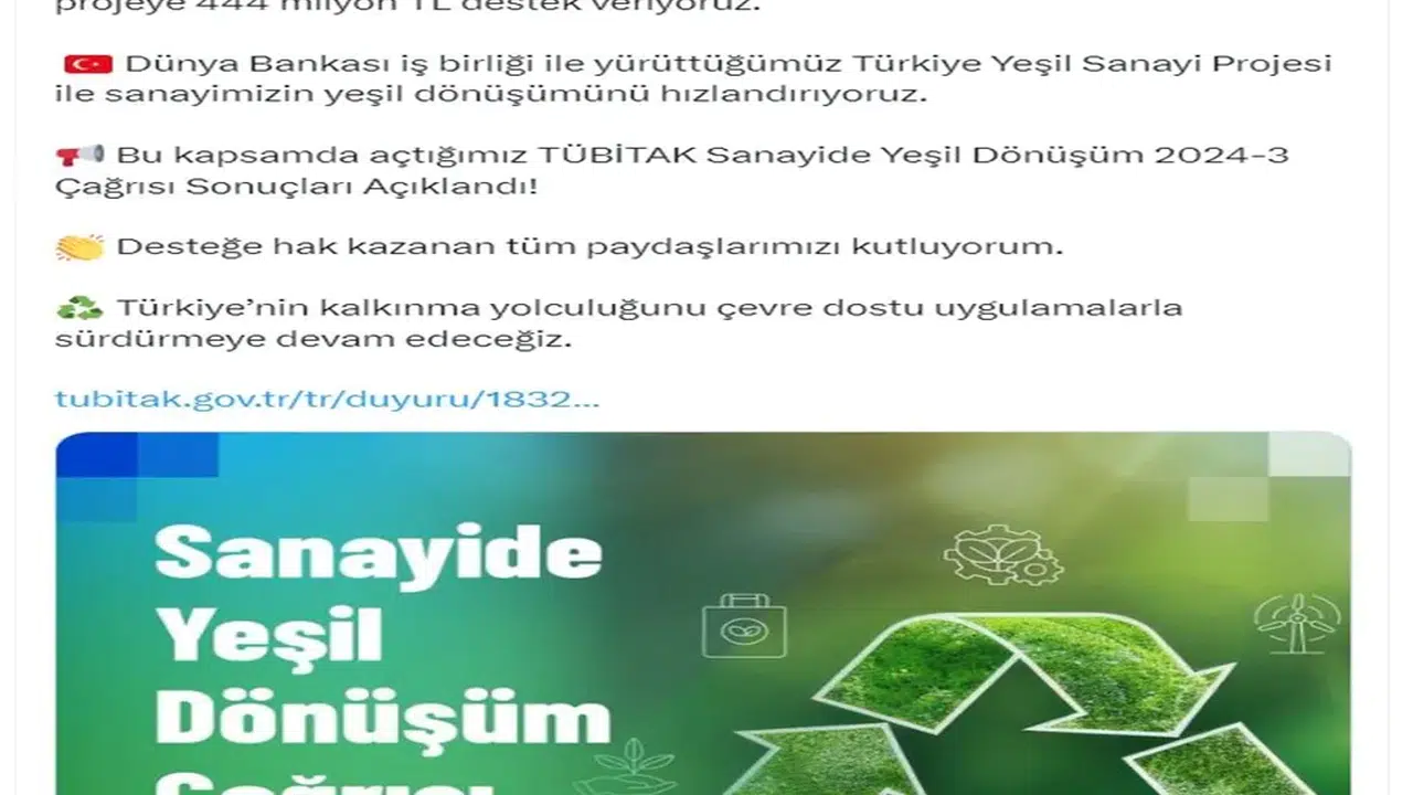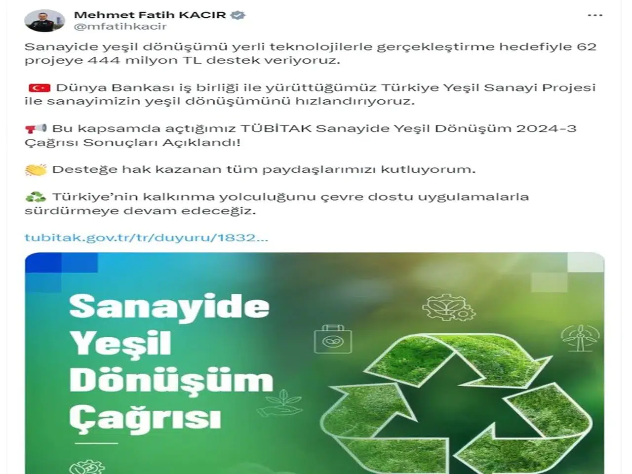 Bakan Kacır, sosyal medya hesabı üzerinden yaptığı açıklamada, sanayide yeşil dönüşümü yerli teknolojilerle gerçekleştirme hedefiyle 62 projeye 444 milyon TL destek verildiğini kaydederek, "Dünya Bankası iş birliği ile yürüttüğümüz Türkiye Yeşil Sanayi Projesi ile sanayimizin yeşil dönüşümünü hızlandırıyoruz. Bu kapsamda açtığımız TÜBİTAK Sanayide Yeşil Dönüşüm 2024-3 Çağrısı sonuçları açıklandı. Desteğe hak kazanan tüm paydaşlarımızı kutluyorum. Türkiye’nin kalkınma yolculuğunu çevre dostu uygulamalarla sürdürmeye devam edeceğiz" dedi. Detaylı bilgiye, 'https://tubitak.gov.tr/tr/duyuru/1832-sanayide-yesil-donusum-2024-3-cagrisinin-sonuclari-aciklandi' internet adresi üzerinden ulaşılabileceği belirtildi.