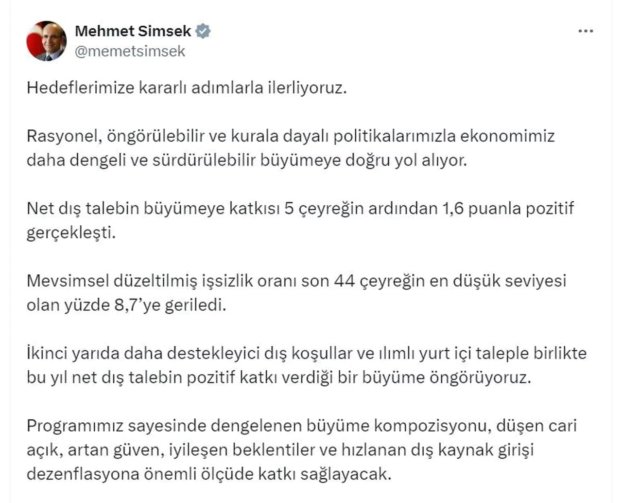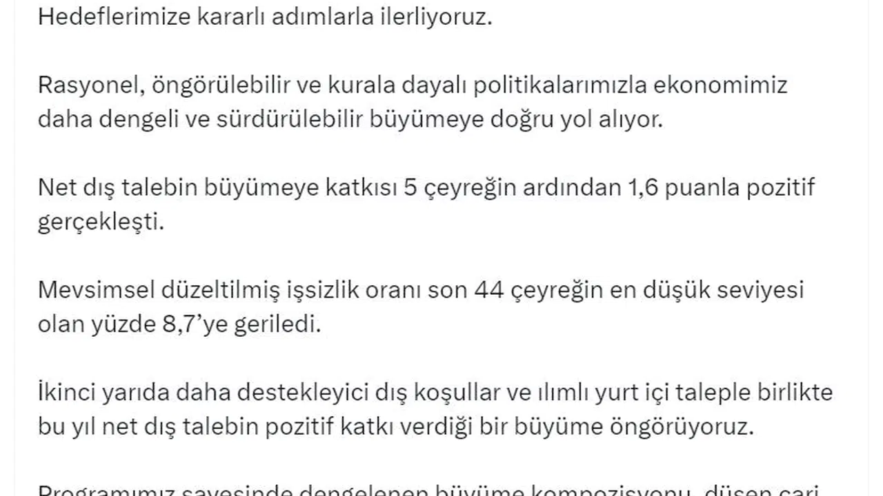 ANKARA, (DHA)- HAZİNE ve Maliye Bakanı Mehmet Şimşek, "Yılın ikinci çeyreğine ilişkin göstergeler ekonomideki dengelenmenin devam ettiğine işaret ediyor. 2024 yılı genelinde net dış talebin pozitif katkı verdiği dengeli bir büyüme öngörüyoruz" dedi.