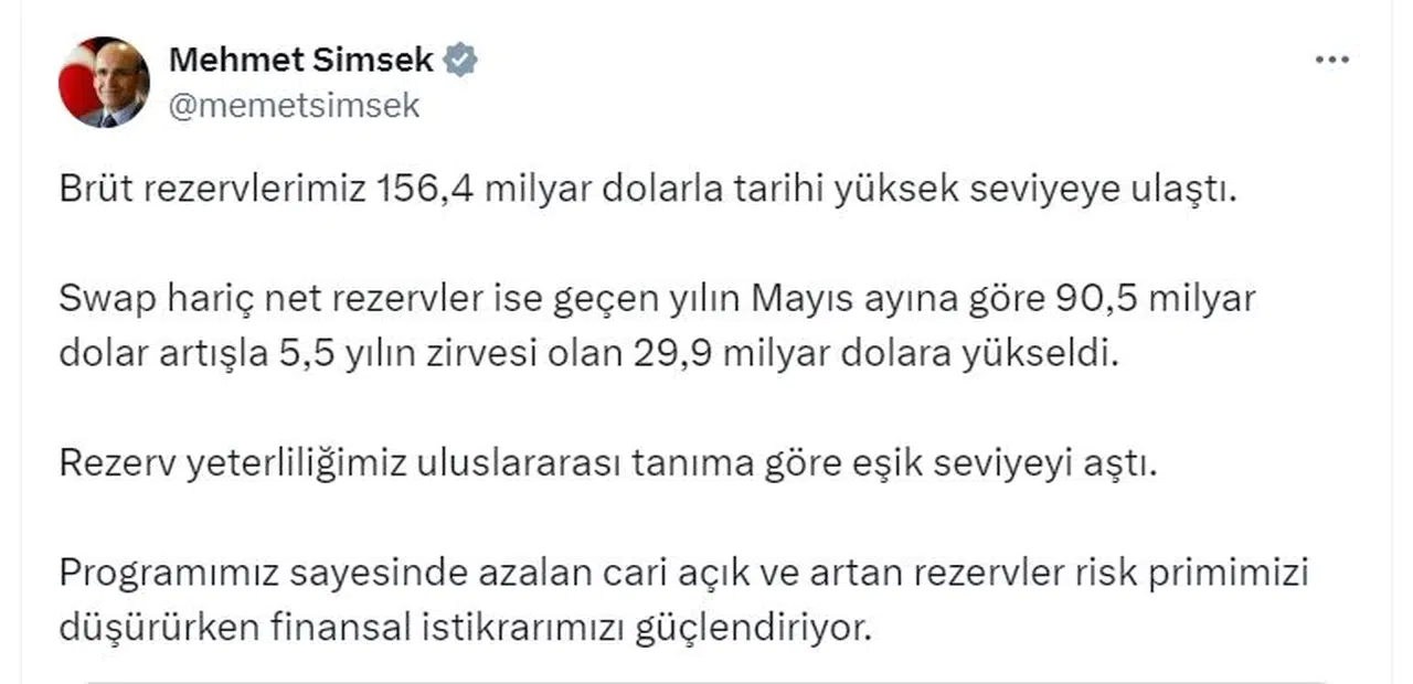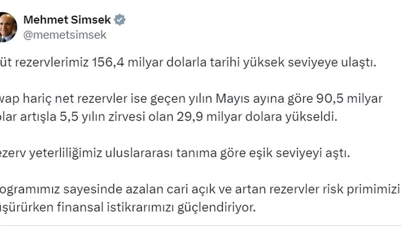 Hazine ve Maliye Bakanı Mehmet Şimşek, sosyal medya hesabından yaptığı açıklamada, "Brüt rezervlerimiz 156,4 milyar dolarla tarihi yüksek seviyeye ulaştı. Swap hariç net rezervler ise geçen yılın mayıs ayına göre 90,5 milyar dolar artışla 5,5 yılın zirvesi olan 29,9 milyar dolara yükseldi. Rezerv yeterliliğimiz uluslararası tanıma göre eşik seviyeyi aştı. Programımız sayesinde azalan cari açık ve artan rezervler risk primimizi düşürürken finansal istikrarımızı güçlendiriyor" ifadelerini kullandı. (DHA)