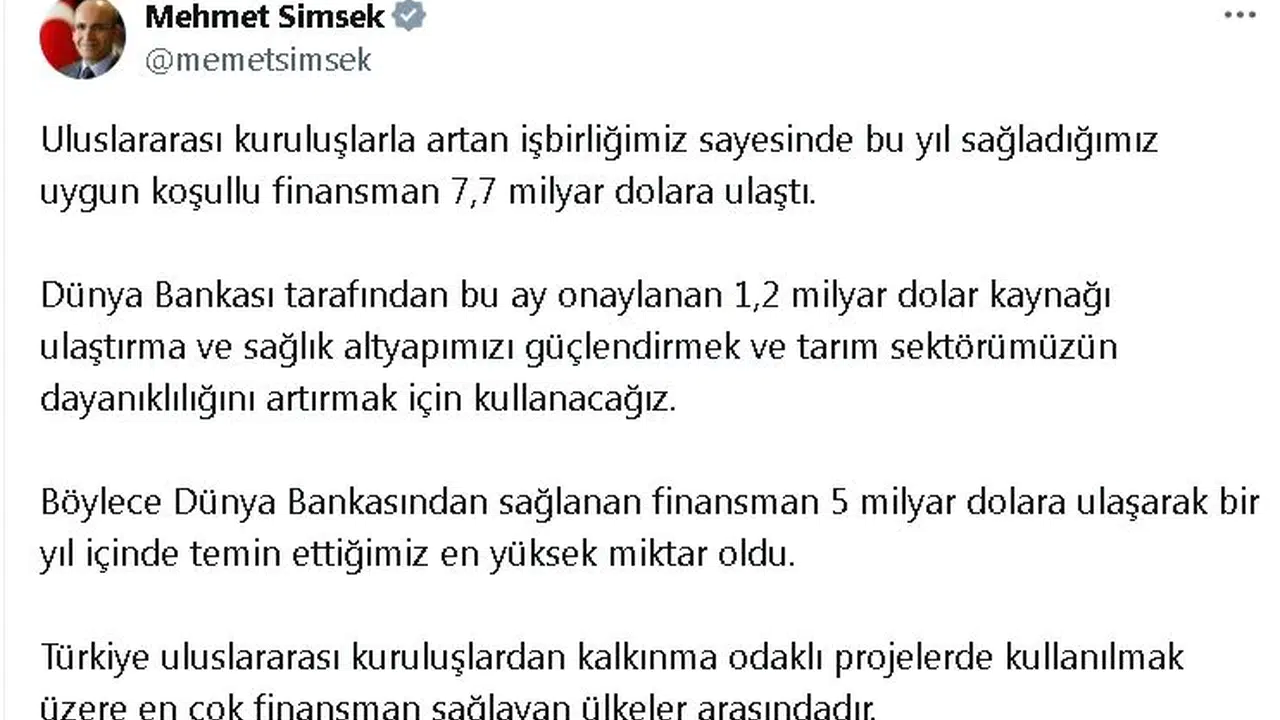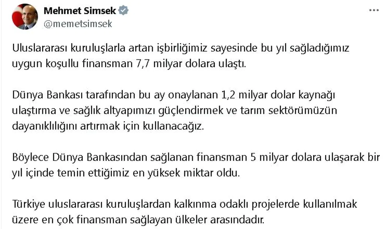 Bakan Şimşek, sosyal medya hesabından yaptığı açıklamada, "Uluslararası kuruluşlarla artan iş birliğimiz sayesinde bu yıl sağladığımız uygun koşullu finansman 7,7 milyar dolara ulaştı. Dünya Bankası tarafından bu ay onaylanan 1,2 milyar dolar kaynağı ulaştırma ve sağlık altyapımızı güçlendirmek ve tarım sektörümüzün dayanıklılığını artırmak için kullanacağız. Böylece Dünya Bankası'ndan sağlanan finansman 5 milyar dolara ulaşarak bir yıl içinde temin ettiğimiz en yüksek miktar oldu. Türkiye uluslararası kuruluşlardan kalkınma odaklı projelerde kullanılmak üzere en çok finansman sağlayan ülkeler arasındadır" ifadelerini kullandı. (DHA)