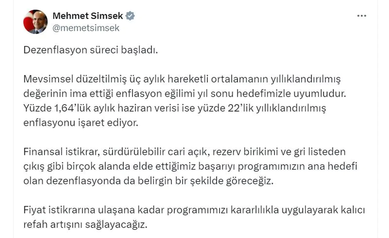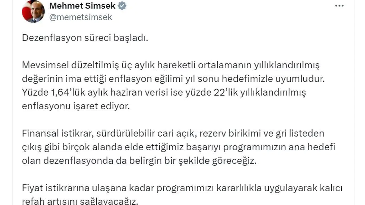 ANKARA, (DHA)- HAZİNE ve Maliye Bakanı Mehmet Şimşek, "Dezenflasyon süreci başladı. Fiyat istikrarına ulaşana kadar programımızı kararlılıkla uygulayarak kalıcı refah artışını sağlayacağız" dedi.