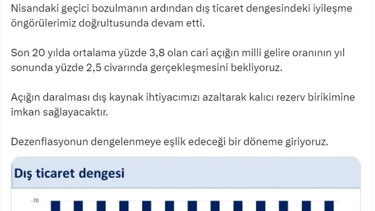 ANKARA, (DHA)- HAZİNE ve Maliye Bakanı Mehmet Şimşek, "Dış dengedeki iyileşme devam ediyor. İhracatın yüzde 11,4 arttığı, ithalatın ise yüzde 10,3 daraldığı mayısta dış ticaret dengesi yıllık 6 milyar dolar iyileşti" dedi.