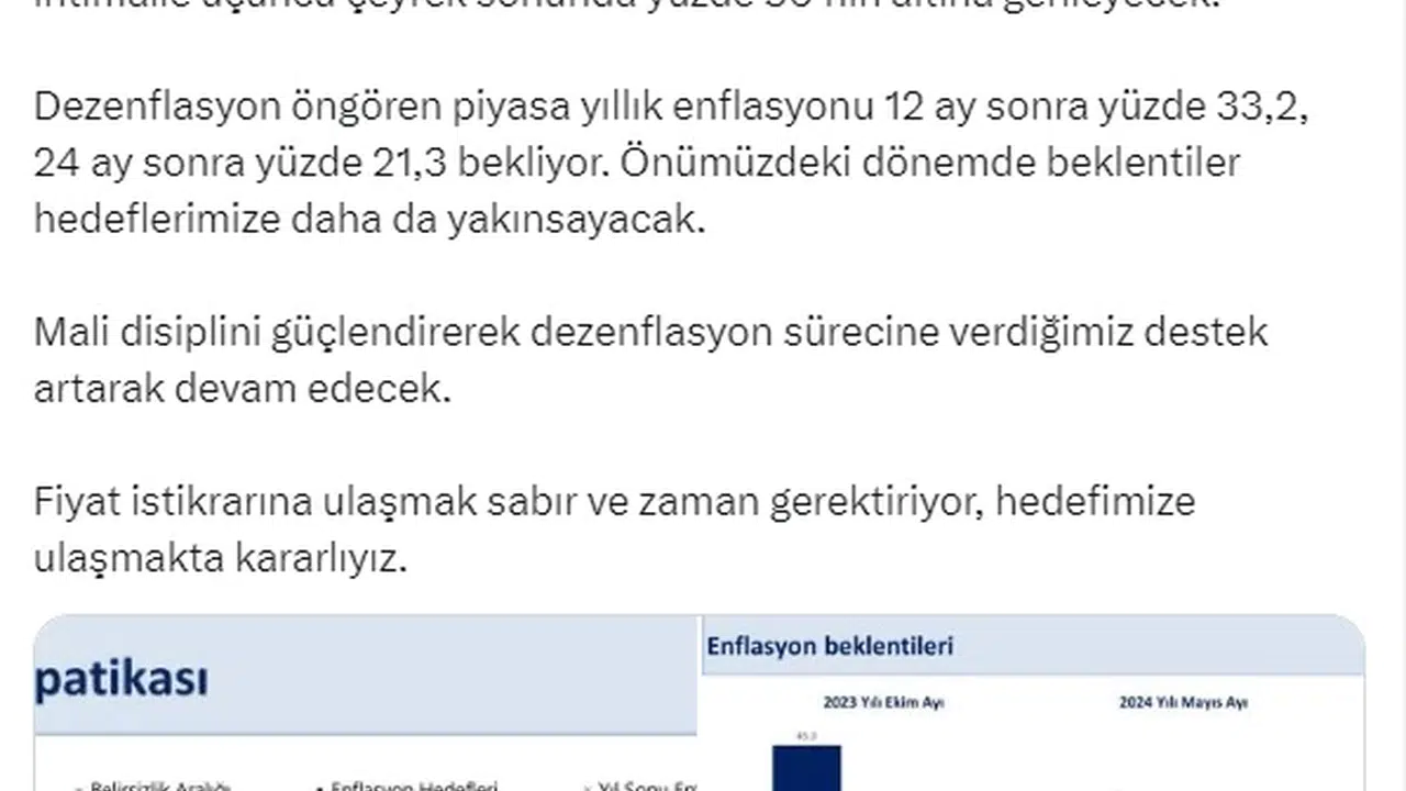 Aliekber METE/ANKARA, (DHA)- HAZİNE ve Maliye Bakanı Mehmet Şimşek, Türkiye İstatistik Kurumu'nun (TÜİK) açıkladığı enflasyon verilerine ilişkin, "En kötüsü geride kaldı. Geçmiş 12 ayın birikimli etkilerini içeren yıllık enflasyonda en yüksek seviyeyi bu ay gördük. Enflasyonla mücadelede geçiş dönemi böylece tamamlandı, dezenflasyon sürecine giriyoruz. Enflasyonda kalıcı düşüş haziranda başlayacak" dedi.