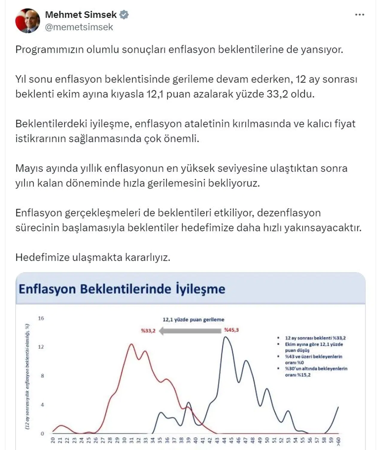 Bakan Şimşek, sosyal medya hesabından yaptığı açıklamada, "Programımızın olumlu sonuçları enflasyon beklentilerine de yansıyor. Yıl sonu enflasyon beklentisinde gerileme devam ederken, 12 ay sonrası beklenti ekim ayına kıyasla 12,1 puan azalarak yüzde 33,2 oldu. Beklentilerdeki iyileşme, enflasyon ataletinin kırılmasında ve kalıcı fiyat istikrarının sağlanmasında çok önemli. Mayıs ayında yıllık enflasyonun en yüksek seviyesine ulaştıktan sonra yılın kalan döneminde hızla gerilemesini bekliyoruz. Enflasyon gerçekleşmeleri de beklentileri etkiliyor, dezenflasyon sürecinin başlamasıyla beklentiler hedefimize daha hızlı yakınsayacaktır. Hedefimize ulaşmakta kararlıyız" ifadelerini kullandı. (DHA)