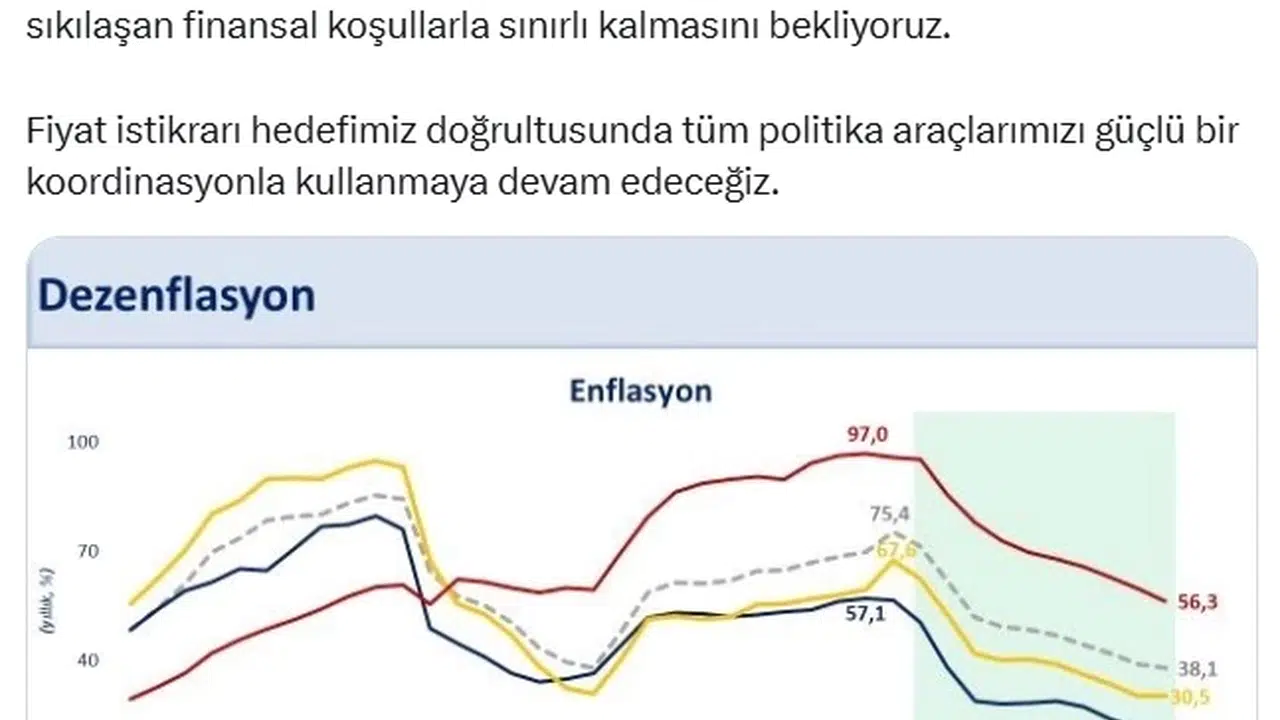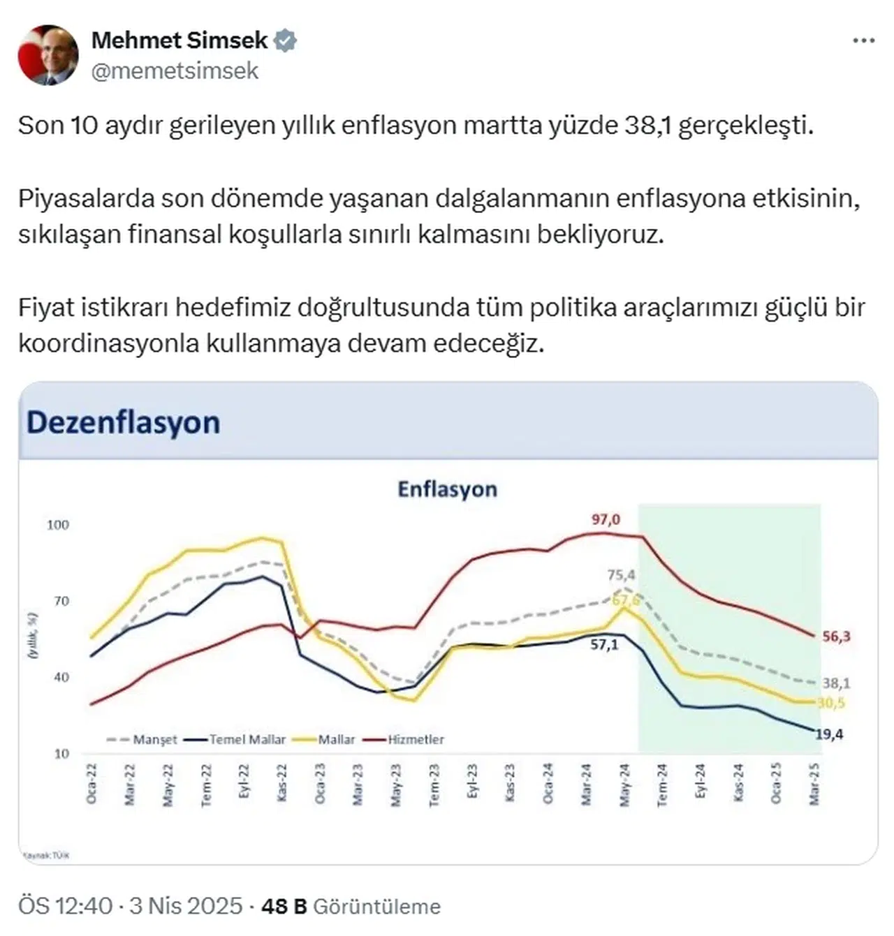 Bakan Mehmet Şimşek, mart ayı enflasyon verilerine ilişkin sosyal medya hesabından yaptığı açıklamada, "Son 10 aydır gerileyen yıllık enflasyon martta yüzde 38,1 gerçekleşti. Piyasalarda son dönemde yaşanan dalgalanmanın enflasyona etkisinin, sıkılaşan finansal koşullarla sınırlı kalmasını bekliyoruz. Fiyat istikrarı hedefimiz doğrultusunda tüm politika araçlarımızı güçlü bir koordinasyonla kullanmaya devam edeceğiz" ifadelerini kullandı. (DHA)
