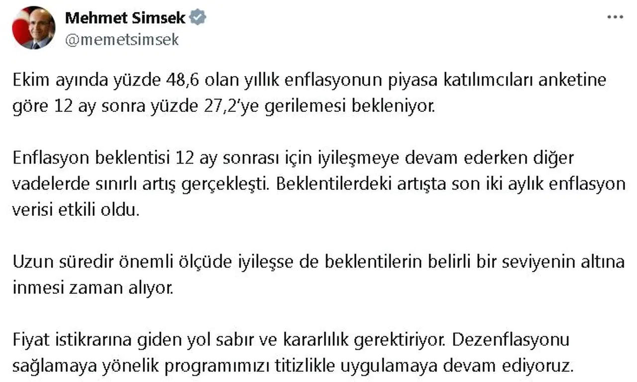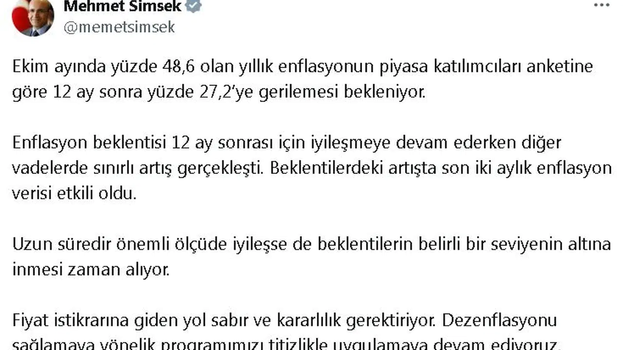 Bakan Şimşek, Türkiye Cumhuriyet Merkez Bankası'nca dün açıklanan Piyasa Katılımcıları Anketi verilerine ilişkin sosyal medya hesabından açıklama yaptı. Şimşek, "Ekim ayında yüzde 48,6 olan yıllık enflasyonun piyasa katılımcıları anketine göre 12 ay sonra yüzde 27,2'ye gerilemesi bekleniyor. Enflasyon beklentisi 12 ay sonrası için iyileşmeye devam ederken diğer vadelerde sınırlı artış gerçekleşti. Beklentilerdeki artışta son 2 aylık enflasyon verisi etkili oldu. Uzun süredir önemli ölçüde iyileşse de beklentilerin belirli bir seviyenin altına inmesi zaman alıyor. Fiyat istikrarına giden yol sabır ve kararlılık gerektiriyor. Dezenflasyonu sağlamaya yönelik programımızı titizlikle uygulamaya devam ediyoruz" dedi. (DHA)
