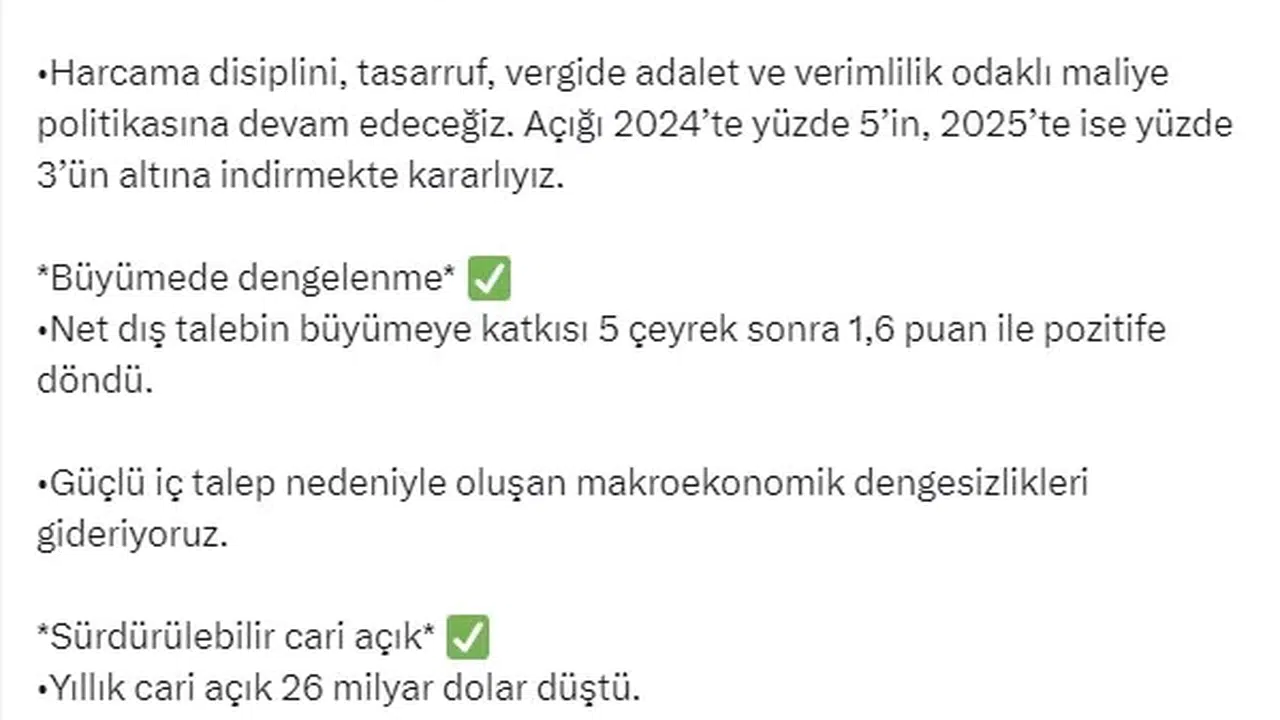 Bakan Şimşek açıklamasında, mali disipline ilişkin, "Bütçe açığı yüksek ama deprem harcamaları hariç açığın milli gelire oranı 2023’te yüzde 1,6 gerçekleşti. Harcama disiplini, tasarruf, vergide adalet ve verimlilik odaklı maliye politikasına devam edeceğiz. Açığı 2024’te yüzde 5’in, 2025’te ise yüzde 3’ün altına indirmekte kararlıyız" dedi. Şimşek, büyümede dengelenmeye ilişkin, "Net dış talebin büyümeye katkısı 5 çeyrek sonra 1,6 puan ile pozitife döndü. Güçlü iç talep nedeniyle oluşan makroekonomik dengesizlikleri gideriyoruz" açıklamasında bulundu.