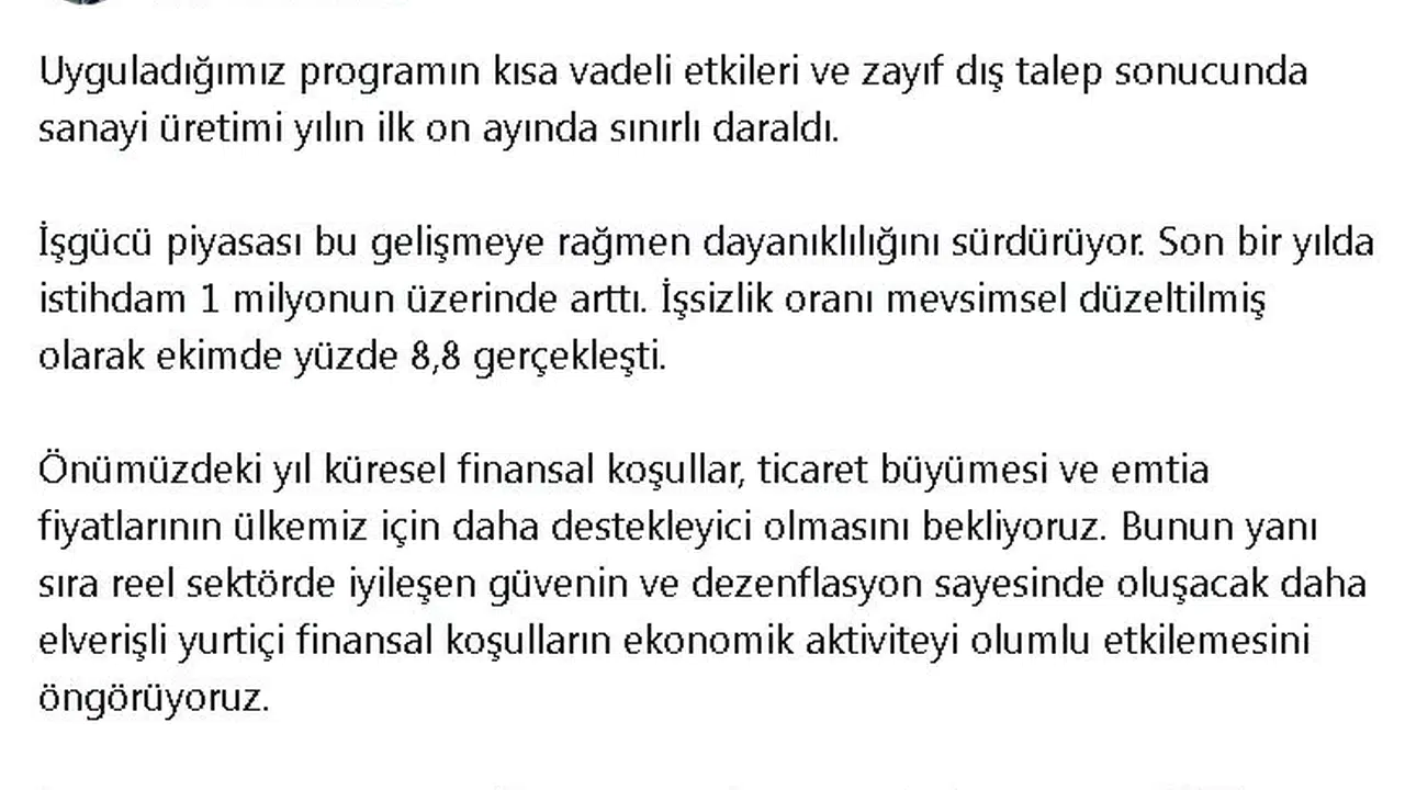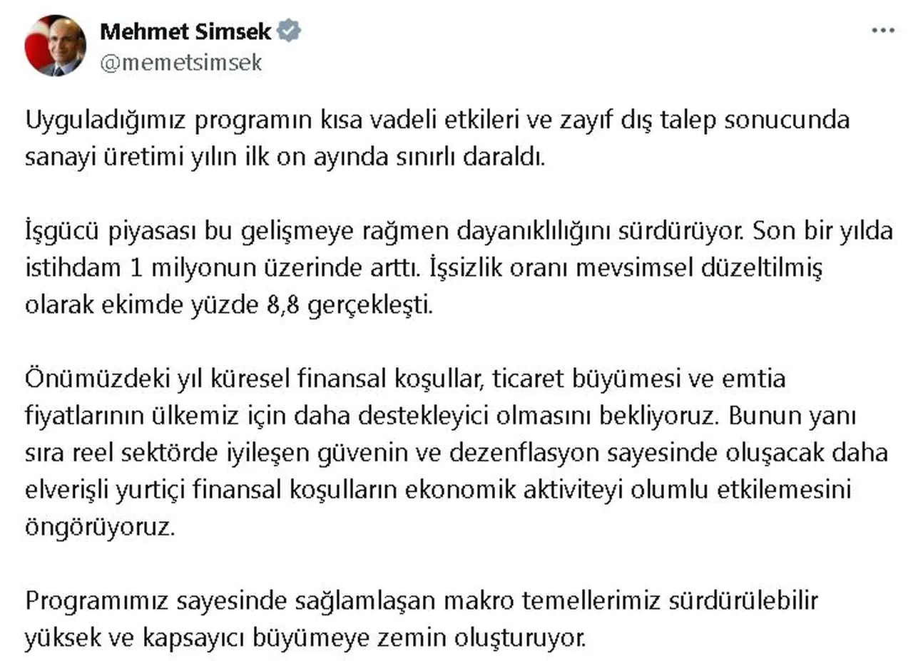 ANKARA, (DHA)- HAZİNE ve Maliye Bakanı Mehmet Şimşek, "Uyguladığımız programın kısa vadeli etkileri ve zayıf dış talep sonucunda sanayi üretimi yılın ilk 10 ayında sınırlı daraldı. İş gücü piyasası bu gelişmeye rağmen dayanıklılığını sürdürüyor" dedi.