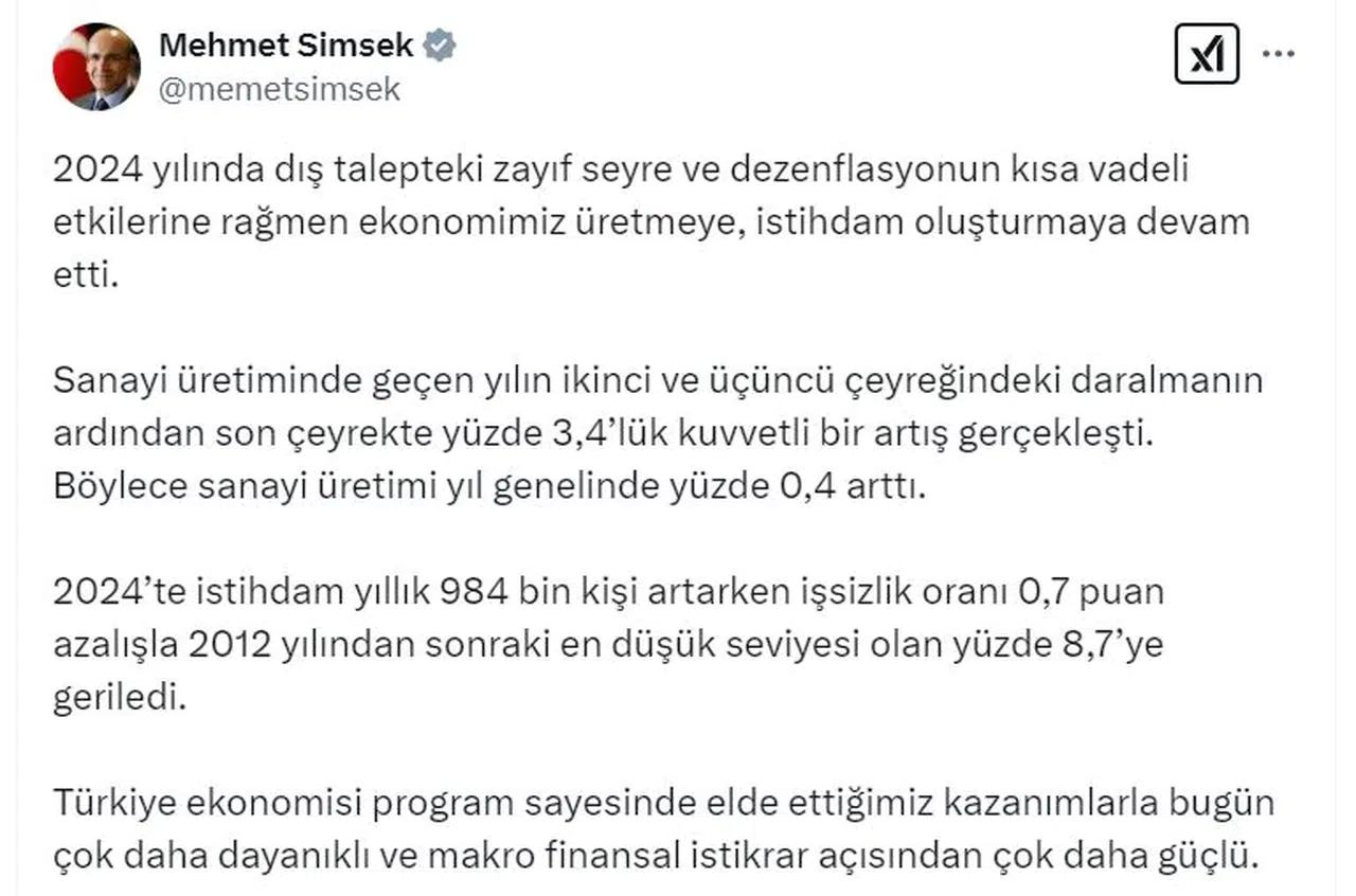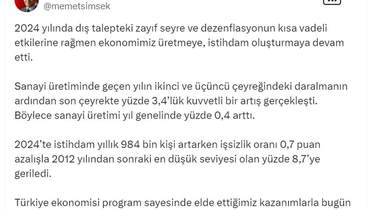 Bakan Şimşek, Türkiye İstatistik Kurumu'nun açıkladığı aralık ayı sanayi üretim endeksi ve işgücü istatistiklerine ilişkin değerlendirmede bulundu. Şimşek, sosyal medya hesabından yaptığı açıklamada, "2024 yılında dış talepteki zayıf seyre ve dezenflasyonun kısa vadeli etkilerine rağmen ekonomimiz üretmeye, istihdam oluşturmaya devam etti. Sanayi üretiminde geçen yılın ikinci ve üçüncü çeyreğindeki daralmanın ardından son çeyrekte yüzde 3,4’lük kuvvetli bir artış gerçekleşti. Böylece sanayi üretimi yıl genelinde yüzde 0,4 arttı. 2024’te istihdam yıllık 984 bin kişi artarken işsizlik oranı 0,7 puan azalışla 2012 yılından sonraki en düşük seviyesi olan yüzde 8,7’ye geriledi. Türkiye ekonomisi program sayesinde elde ettiğimiz kazanımlarla bugün çok daha dayanıklı ve makro finansal istikrar açısından çok daha güçlü" ifadelerini kullandı. (DHA)
