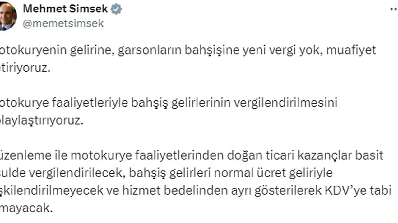 Bakan Şimşek, sosyal medya hesabından yaptığı açıklamada, "Motokuryenin gelirine, garsonların bahşişine yeni vergi yok, muafiyet getiriyoruz. Motokurye faaliyetleriyle bahşiş gelirlerinin vergilendirilmesini kolaylaştırıyoruz. Düzenleme ile motokurye faaliyetlerinden doğan ticari kazançlar basit usulde vergilendirilecek, bahşiş gelirleri normal ücret geliriyle ilişkilendirilmeyecek ve hizmet bedelinden ayrı gösterilerek KDV'ye (Katma Değer Vergisi) tabi olmayacak" ifadelerini kullandı. (DHA)