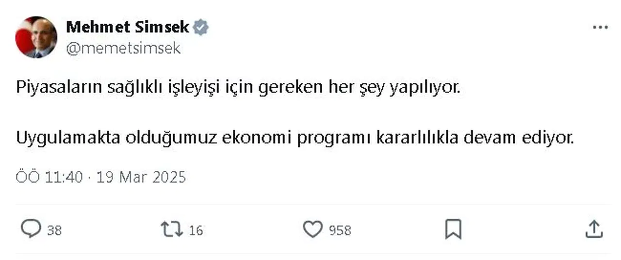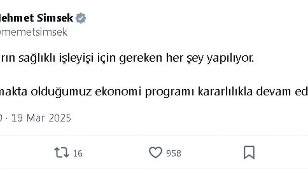 Bakan Şimşek, sosyal medya hesabından yaptığı açıklamada, "Piyasaların sağlıklı işleyişi için gereken her şey yapılıyor. Uygulamakta olduğumuz ekonomi programı kararlılıkla devam ediyor" ifadelerini kullandı. (DHA)