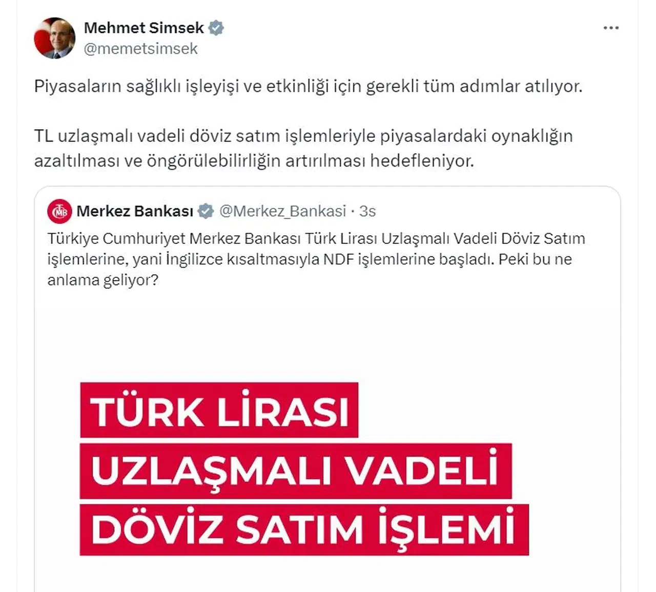 ANKARA, (DHA)- HAZİNE ve Maliye Bakanı Mehmet Şimşek, Türkiye Cumhuriyet Merkez Bankası'nın (TCMB) TL uzlaşmalı vadeli döviz satım işlemleri başlatmasına ilişkin, "Piyasaların sağlıklı işleyişi ve etkinliği için gerekli tüm adımlar atılıyor" dedi.