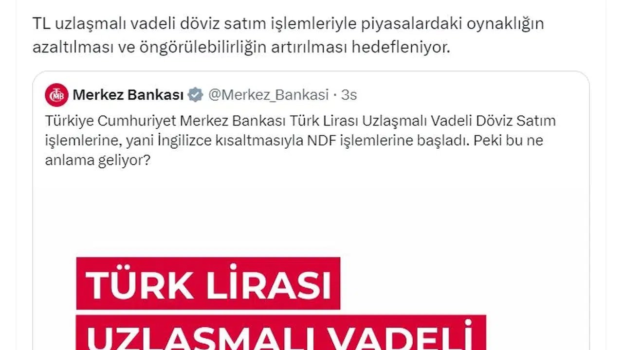 TCMB, döviz piyasasının sağlıklı çalışması, kurlarda oynaklıkların engellenmesi ve döviz likiditesinin dengelenmesi amacıyla TL uzlaşmalı vadeli döviz satım işlemlerine başladı. Hazine ve Maliye Bakanı Mehmet Şimşek, TCMB'nin konuyla ilgili sosyal medya paylaşımını alıntılayarak, "Piyasaların sağlıklı işleyişi ve etkinliği için gerekli tüm adımlar atılıyor. TL uzlaşmalı vadeli döviz satım işlemleriyle piyasalardaki oynaklığın azaltılması ve öngörülebilirliğin artırılması hedefleniyor" ifadelerini kullandı. (DHA)