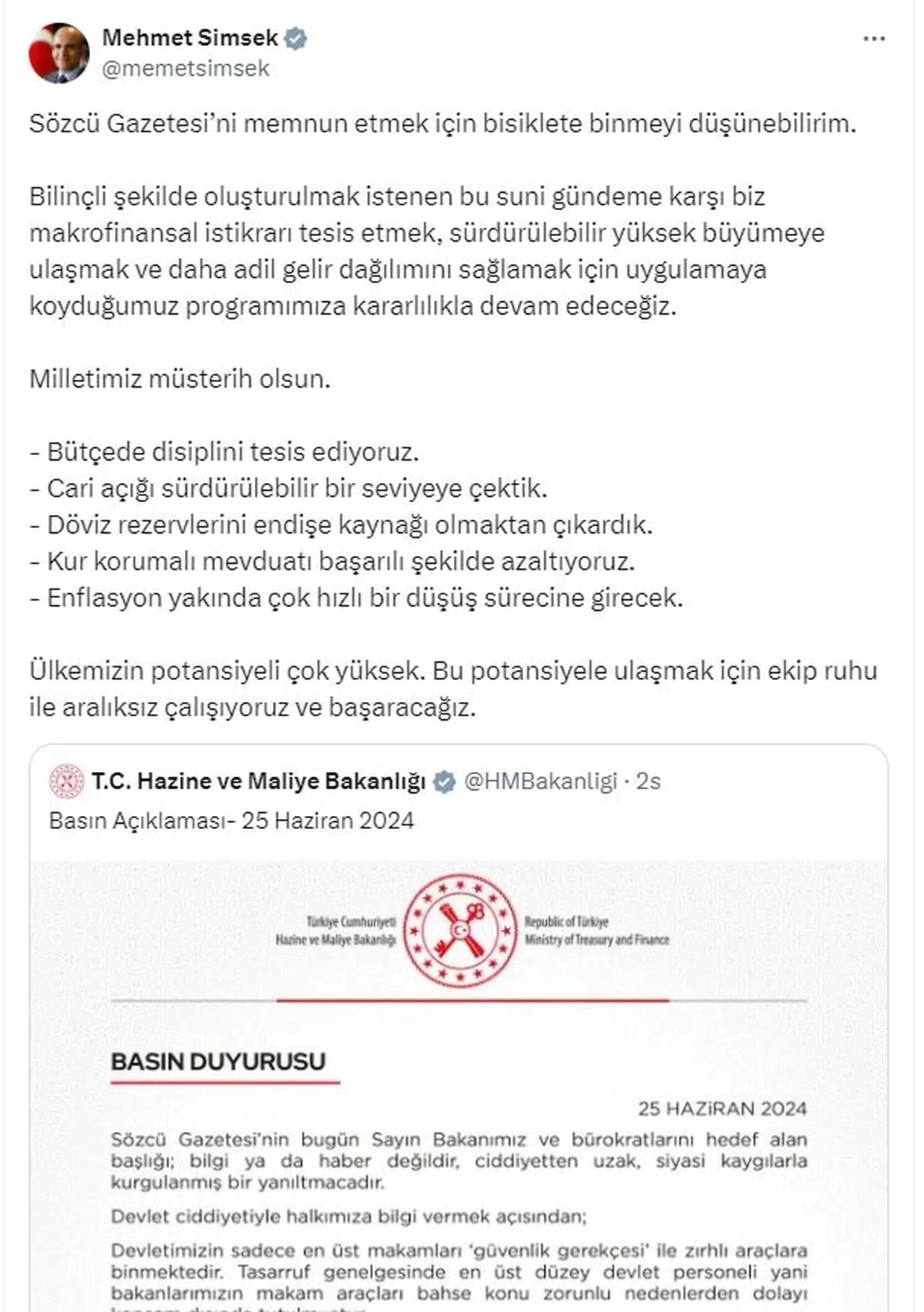 Bakan Şimşek, makam aracıyla ilgili yapılan haberlere ilişkin sosyal medya hesabından açıklama yaptı. Şimşek, "Bilinçli şekilde oluşturulmak istenen suni gündeme karşı biz makrofinansal istikrarı tesis etmek, sürdürülebilir yüksek büyümeye ulaşmak ve daha adil gelir dağılımını sağlamak için uygulamaya koyduğumuz programımıza kararlılıkla devam edeceğiz. Milletimiz müsterih olsun. Bütçede disiplini tesis ediyoruz. ⁠Cari açığı sürdürülebilir bir seviyeye çektik. ⁠Döviz rezervlerini endişe kaynağı olmaktan çıkardık. Kur korumalı mevduatı başarılı şekilde azaltıyoruz. ⁠Enflasyon yakında çok hızlı bir düşüş sürecine girecek. Ülkemizin potansiyeli çok yüksek. Bu potansiyele ulaşmak için ekip ruhu ile aralıksız çalışıyoruz ve başaracağız" ifadelerini kullandı.