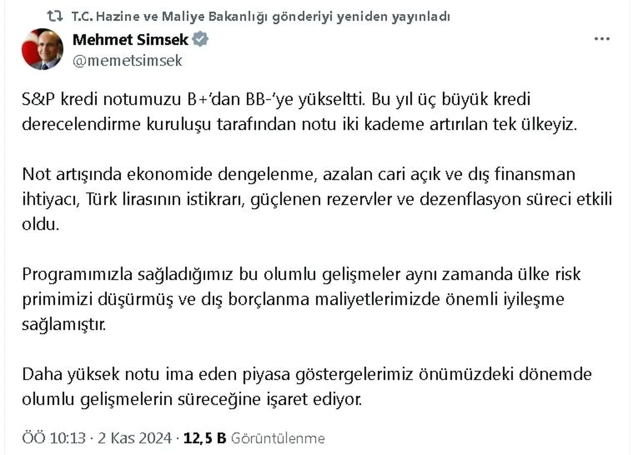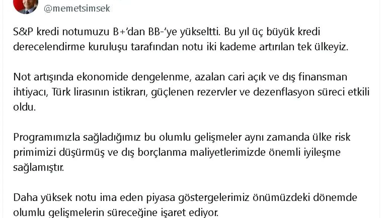 ANKARA, (DHA)- HAZİNE ve Maliye Bakanı Mehmet Şimşek, kredi derecelendirme kuruluşu S&P'nin, Türkiye'nin kredi notunu B+'dan BB-'ye yükselttiğini, bu yıl 3 büyük kredi derecelendirme kuruluşu tarafından notu 2 kademe artırılan tek ülkenin Türkiye olduğunu açıkladı.
