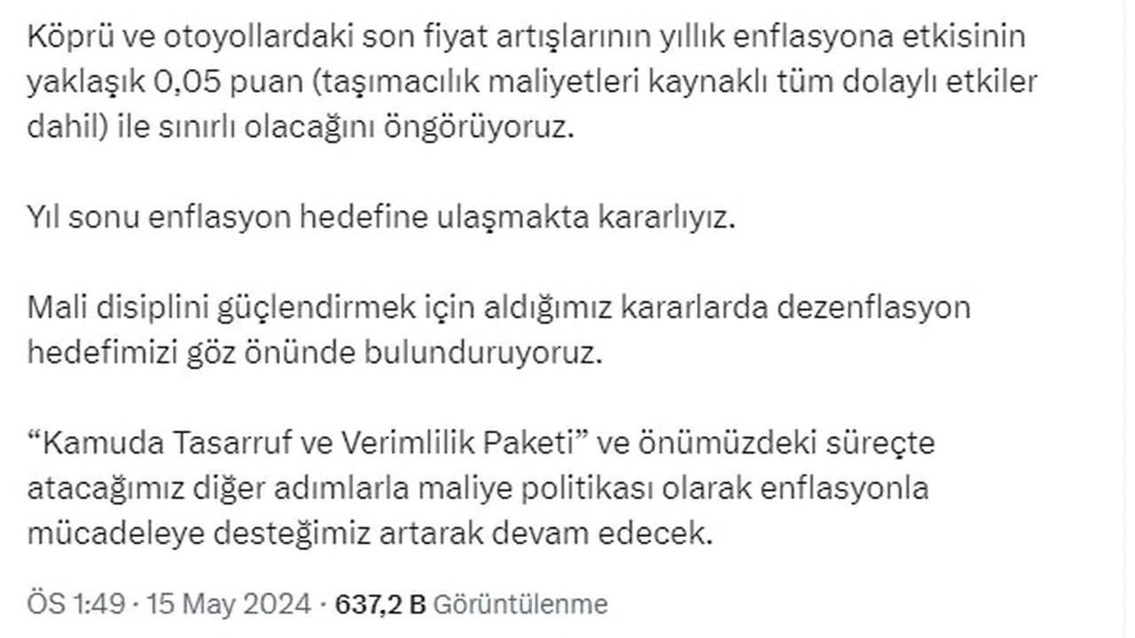 Hazine ve Maliye Bakanı Mehmet Şimşek, sosyal medya hesabından yaptığı açıklamada, "Köprü ve otoyollardaki son fiyat artışlarının yıllık enflasyona etkisinin yaklaşık 0,05 puan (taşımacılık maliyetleri kaynaklı tüm dolaylı etkiler dahil) ile sınırlı olacağını öngörüyoruz. Yıl sonu enflasyon hedefine ulaşmakta kararlıyız. Mali disiplini güçlendirmek için aldığımız kararlarda dezenflasyon hedefimizi göz önünde bulunduruyoruz. 'Kamuda Tasarruf ve Verimlilik Paketi' ve önümüzdeki süreçte atacağımız diğer adımlarla maliye politikası olarak enflasyonla mücadeleye desteğimiz artarak devam edecek" ifadelerini kullandı. (DHA)