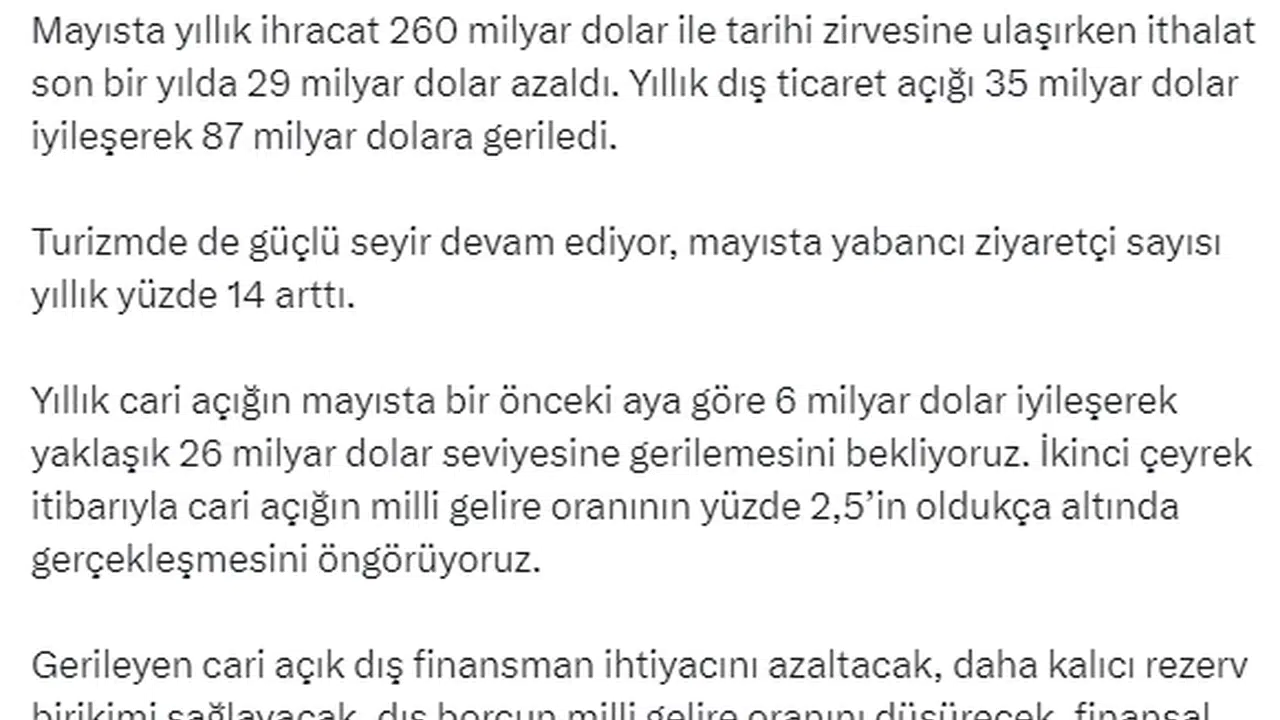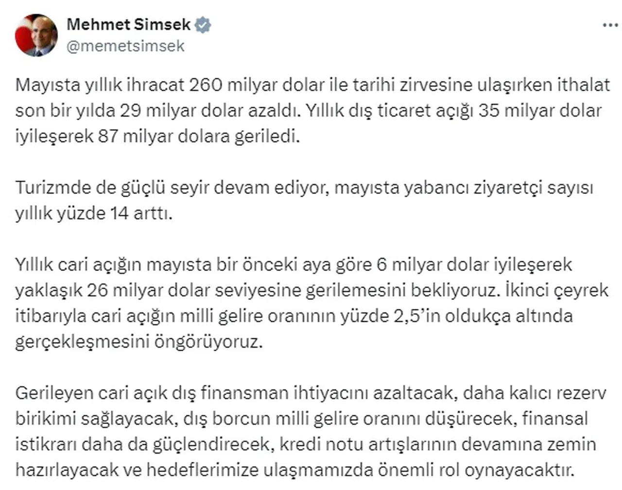 Aliekber METE/ANKARA, (DHA)- HAZİNE ve Maliye Bakanı Mehmet Şimşek, "Mayısta yıllık ihracat 260 milyar dolar ile tarihi zirvesine ulaşırken, ithalat son bir yılda 29 milyar dolar azaldı. Yıllık dış ticaret açığı 35 milyar dolar iyileşerek 87 milyar dolara geriledi" dedi.