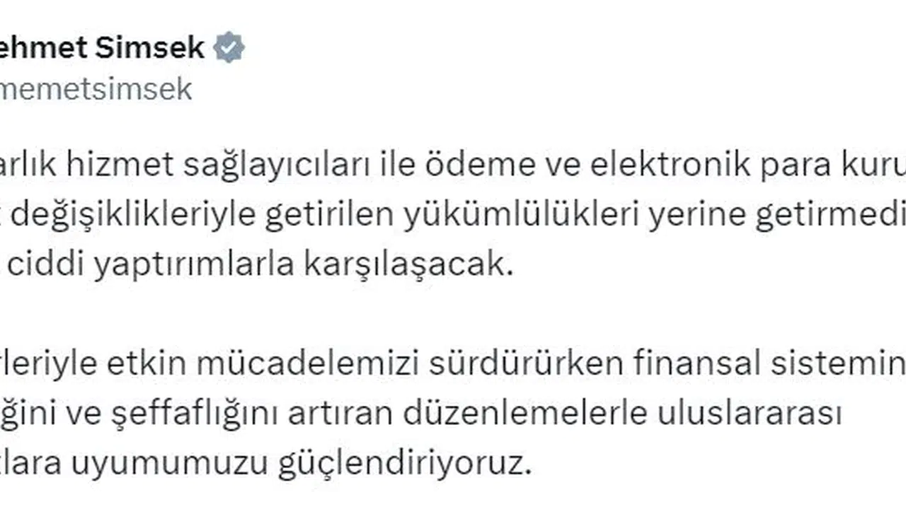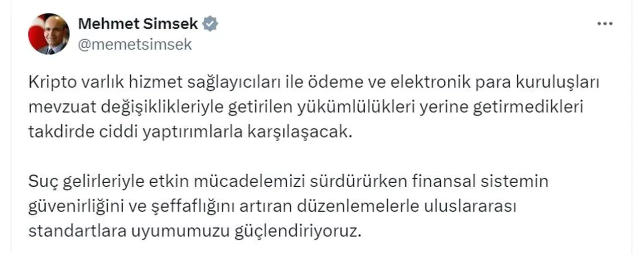 Bakan Şimşek, sosyal medya hesabından yaptığı açıklamada, "Kripto varlık hizmet sağlayıcıları ile ödeme ve elektronik para kuruluşları mevzuat değişiklikleriyle getirilen yükümlülükleri yerine getirmedikleri takdirde ciddi yaptırımlarla karşılaşacak. Suç gelirleriyle etkin mücadelemizi sürdürürken finansal sistemin güvenirliğini ve şeffaflığını artıran düzenlemelerle uluslararası standartlara uyumumuzu güçlendiriyoruz" dedi. (DHA)