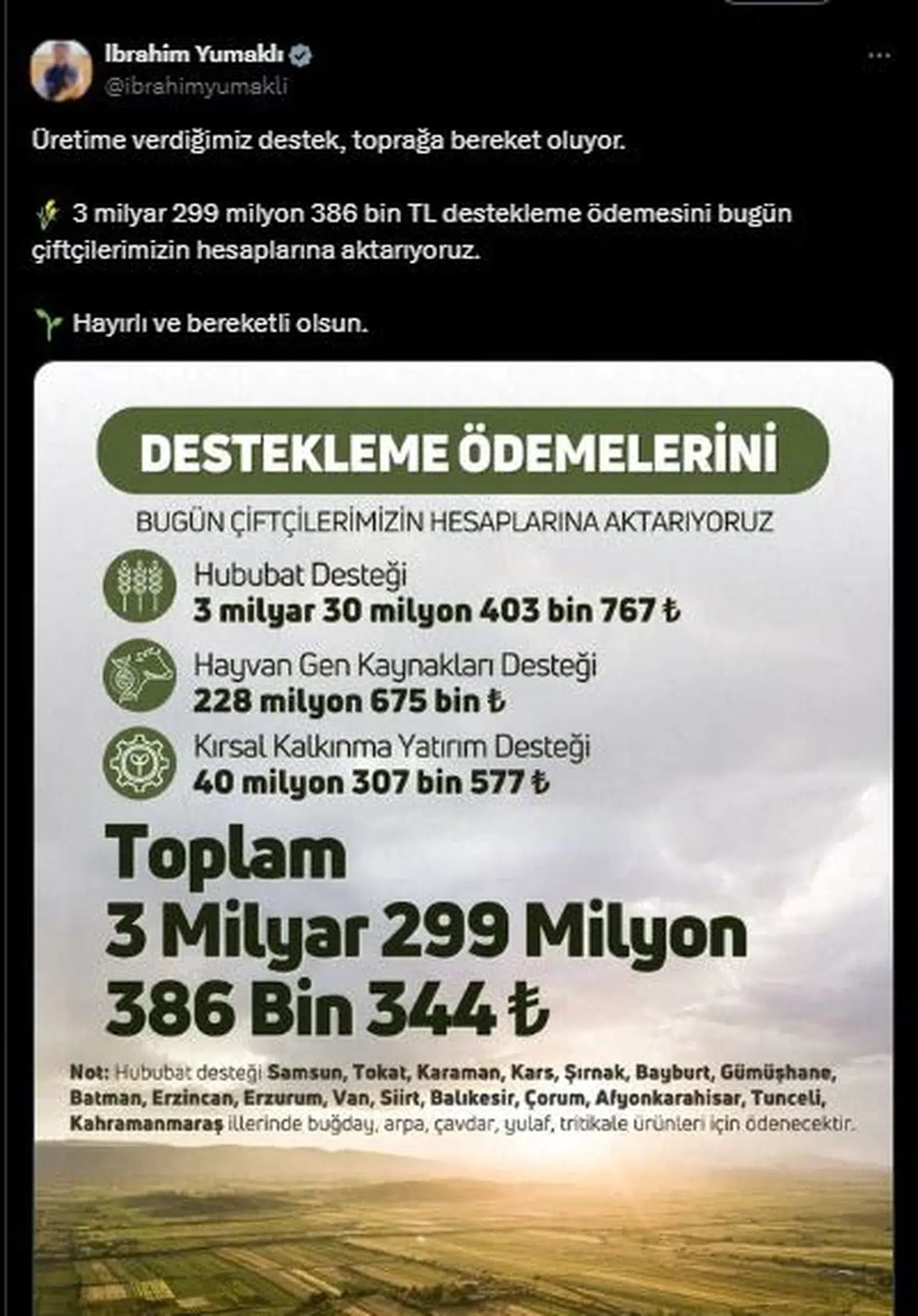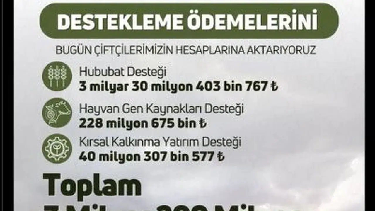 Tarım ve Orman Bakanı İbrahim Yumaklı, sosyal medya hesabından yaptığı açıklamada, 3 milyar 30 milyon 403 bin 767 TL Hububat Desteği, 228 milyon 675 bin TL Hayvan Gen Kaynakları Desteği, 40 milyon 307 bin 577 TL Kırsal Kalkınma Yatırım Desteği olmak üzere toplamda 3 milyar 299 milyon 386 bin 344 TL tarımsal destekleme ödemesini bugün çiftçilerin hesaplarına aktardıklarını belirtti. Bakan Yumaklı, Hububat Desteği'nin; Samsun, Tokat, Karaman, Kars, Şırnak, Bayburt, Gümüşhane, Batman, Erzincan, Erzurum, Van, Siirt, Balıkesir, Çorum, Afyonkarahisar, Tunceli ve Kahramanmaraş illerinde buğday, arpa, çavdar, yulaf, tritikale ürünleri için ödeneceğini açıkladı. (DHA)