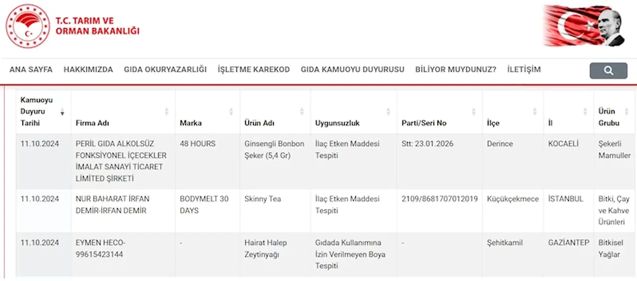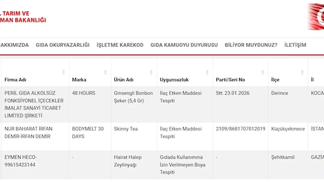 Tarım ve Orman Bakanlığı, gıda denetimleri sonucunda ortaya çıkan uygunsuzlukları, bakanlığın web sitesinde yer alan 'Yeni Gıda Kamuoyu Duyurusu Sistemi'nde ilan ediyor. 17 Aralık 2011 tarihli Gıda ve Yemin Resmi Kontrolüne Dair Yönetmeliğin 8'inci maddesi gereğince kişilerin hayatını ve sağlığını tehlikeye düşürecek şekilde bozulmuş, değiştirilmiş gıdaları üreten veya satan firmaların adı, ürün adı, markası, parti ve seri numarası burada paylaşılıyor. Sitede 'Sağlığı Tehlikeye Düşürecek Gıdalar' bölümünde; merkezi Gaziantep'in Şehitkamil ilçesinde bulunan 'Eymen Heco' firmasının 'Hairat Halep Zeytinyağı' ürününde gıdada kullanımına izin verilmeyen boya tespit edildiği belirtildi. Yine Kocaeli'nin Derince ilçesindeki 'Peril Gıda Alkolsüz Fonksiyonel İçecekler' şirketinin glisengli bonbon şeker ürününde ve İstanbul'un Küçükçekmece ilçesindeki 'Nur Baharat' firmasının ürettiği poşet çayda ilaç etken maddesi tespit edildiği belirtildi. (DHA)